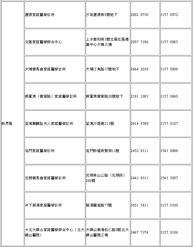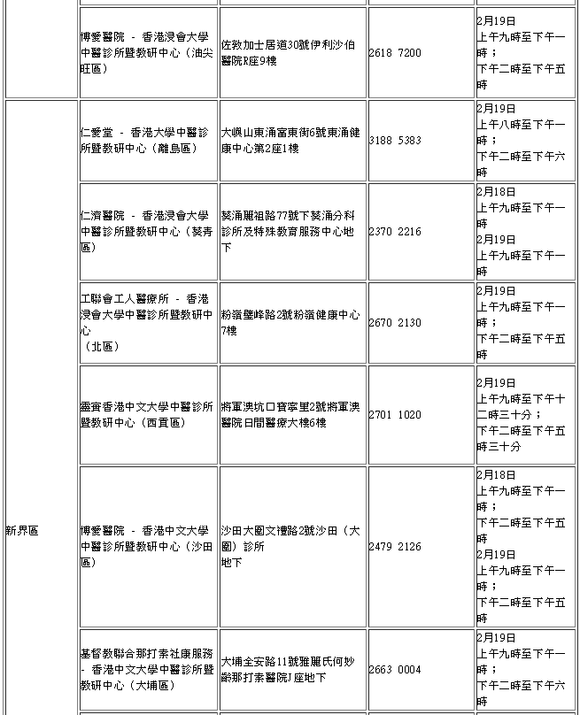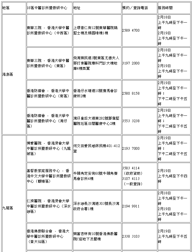 農曆新年假期期間(2月18日至19日)18區中醫診所暨教研中心服務安排