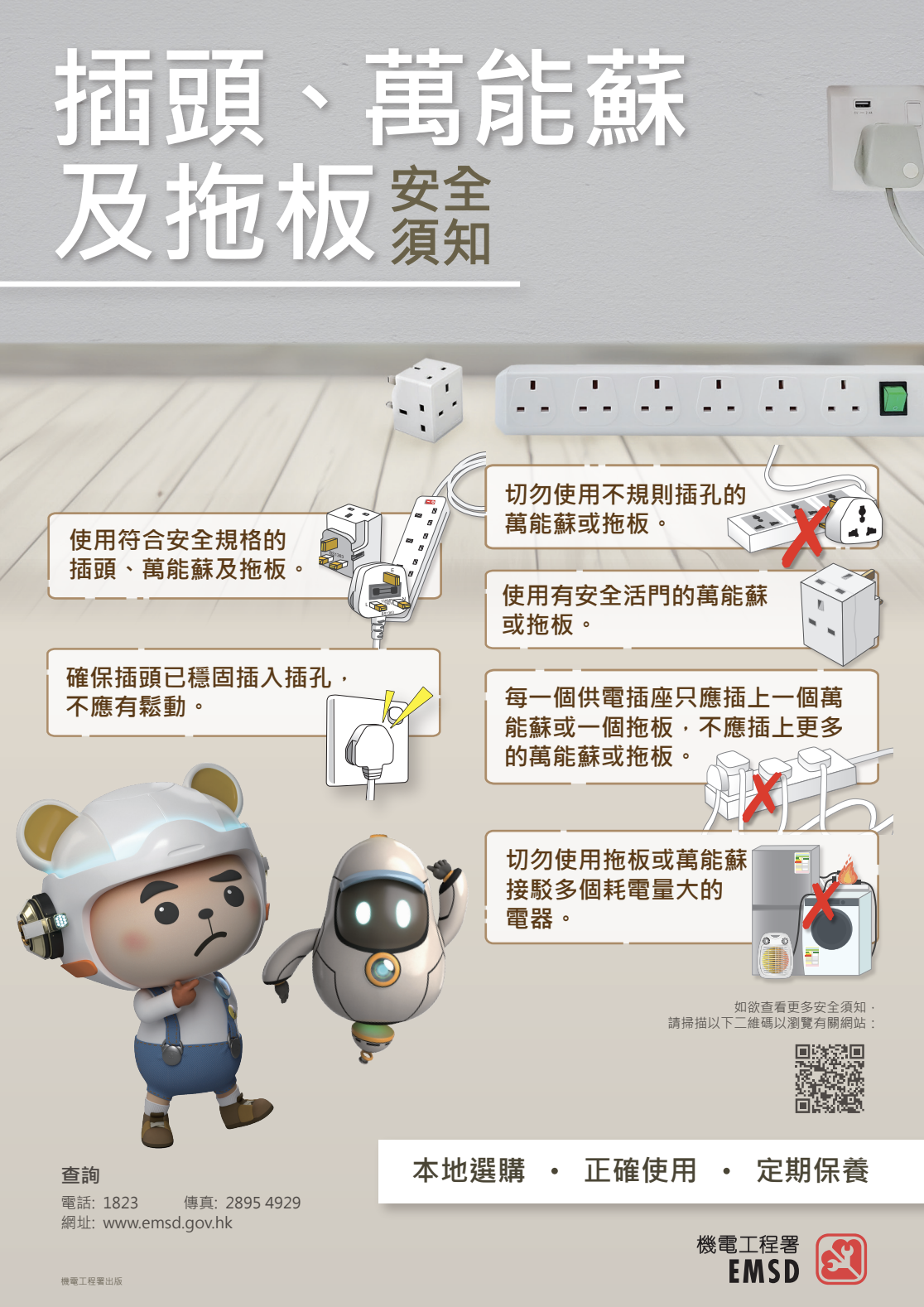 機電工程署列出一份簡潔的家用電器產品安全貼士,提醒市民留意以下幾點: