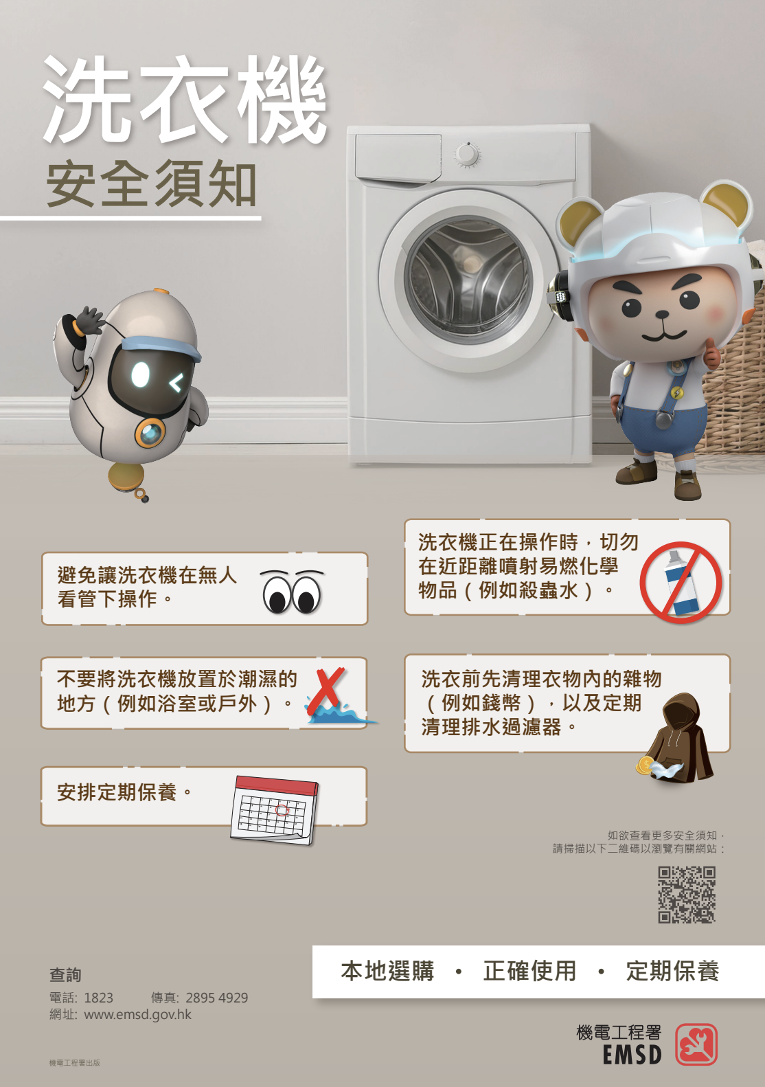 此外,機電署一直積極主動加強宣傳及教育工作,向市民宣導正確使用和清潔保養家用電器產品的重要性。機電署會和民政事務總署合作舉辦地區講座、在學校舉辦講座、在地區擺設攤位遊戲,以及在不同社交媒體平台宣傳,循不同渠道向市民提供安全使用家用電器產品的資訊。