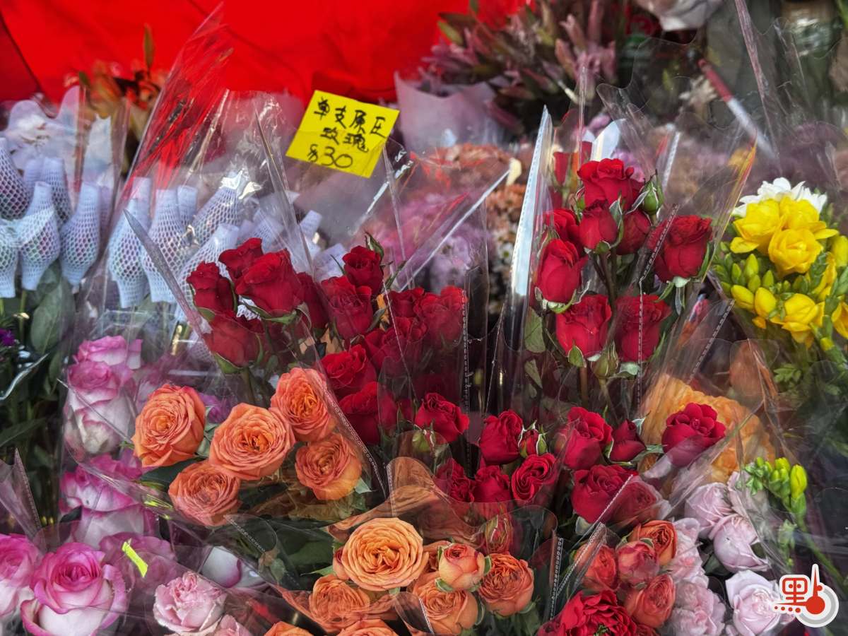 點新聞記者在現場所見,為了兼顧農曆新年與情人節的雙重需求,許多花店在主打蝴蝶蘭、百合、銀柳等傳統年花的基礎上,特意開闢出一塊區域,專門售賣應節的玫瑰花。放眼望去,紅、粉兩色玫瑰成為今日「最佳配角」。據了解,目前單枝玫瑰的零售價約在30至40港幣之間。