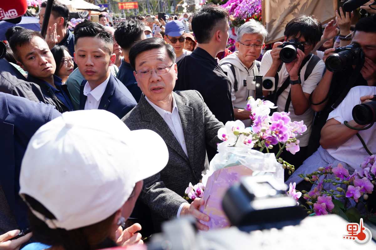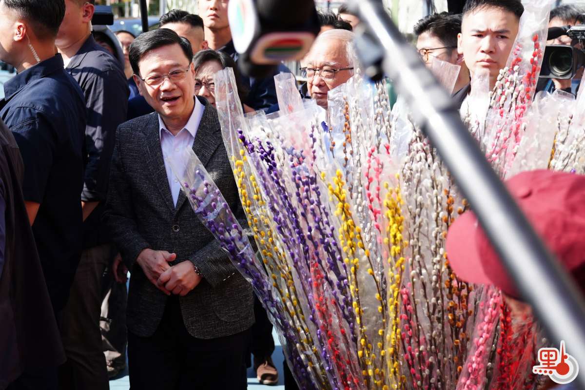 其後,李家超一行又同市民打招呼,並繼續到訪不同攤位。他再購買了價值80元的「五代同堂」,又拿出100元向商戶說「十全十美唔使找」。之後,再以800元分別購買一束199元、和一盆598元的蘭花,祝福商戶「大家都發、馬年一路發」。