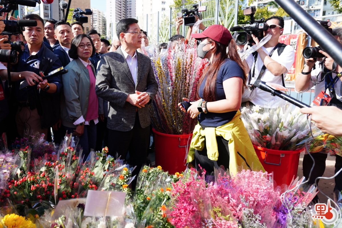 現場攤檔擺滿年花和賀年飾品,琳瑯滿目,氣氛熱鬧。在入場後的第一個檔口,李家超與女檔主攀談,詢問生意及人流情況,並花費120元購買了4枝銀柳。
