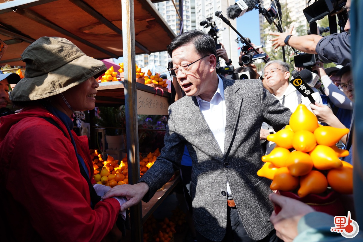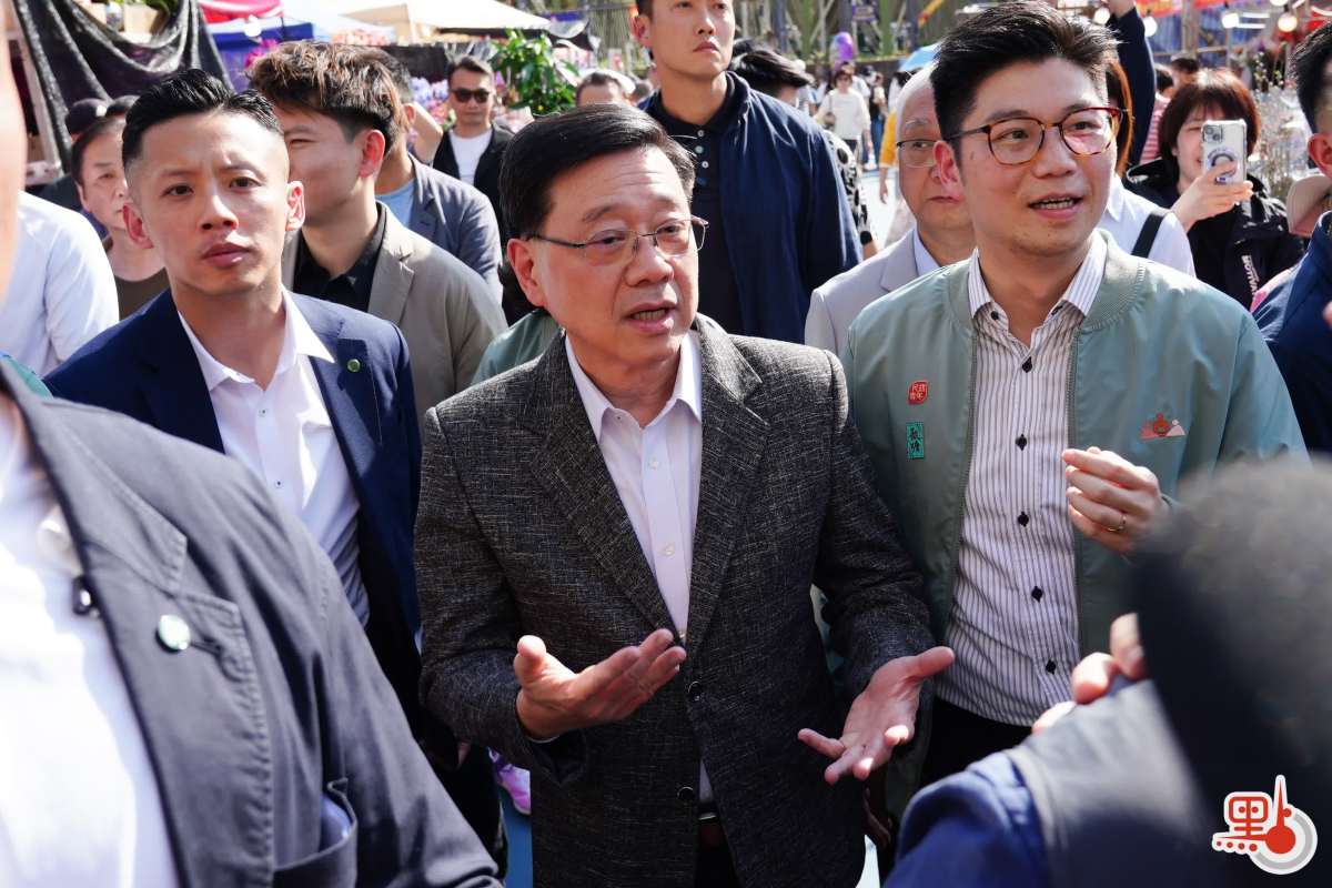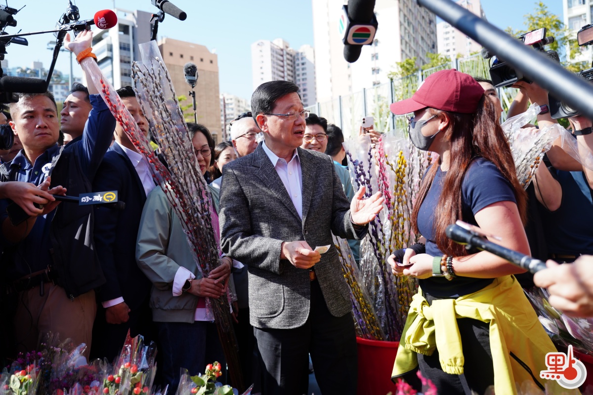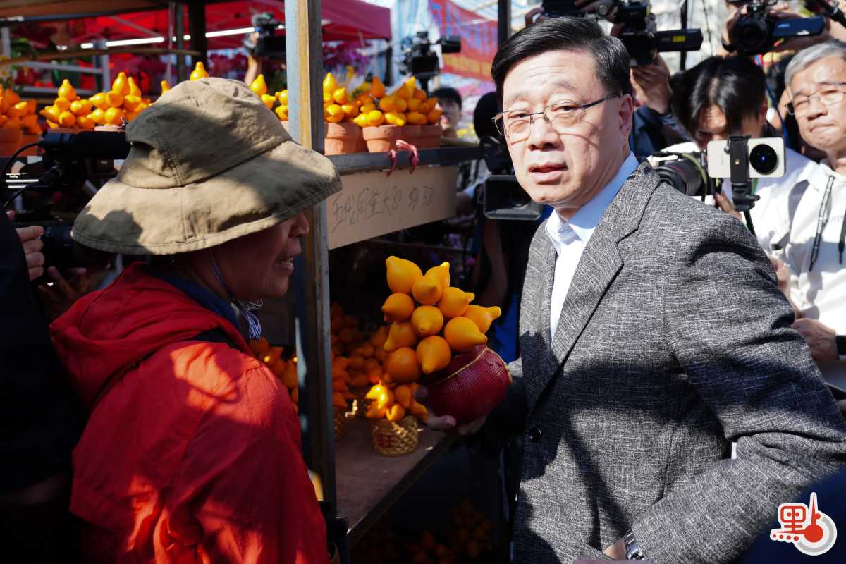 【點新聞報道】今日(16日)年廿九,是團年喜慶的日子。行政長官李家超繼上周歲晚家訪後,今日下午聯同民政及青年事務局局長麥美娟、環境及生態局局長謝展寰等官員,到訪觀塘遊樂場年宵市場,同市民共賀馬年。李家超先花費120元購買銀柳,寓意財富滾滾,後購買價值80元的「五代同堂」,然後掏出100元付款,向商戶說「十全十美唔使找」;再以800元分別購買一束199元和一盆598元的蘭花,祝商戶「大家都發、馬年一路發」。