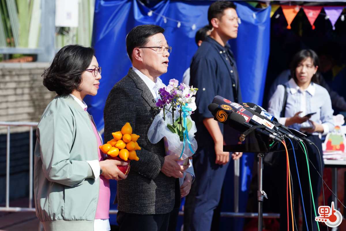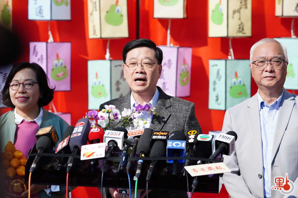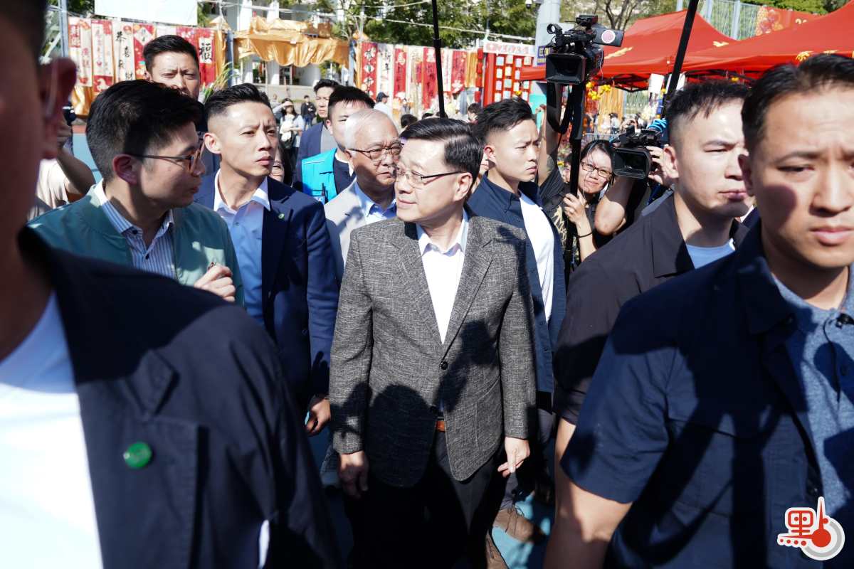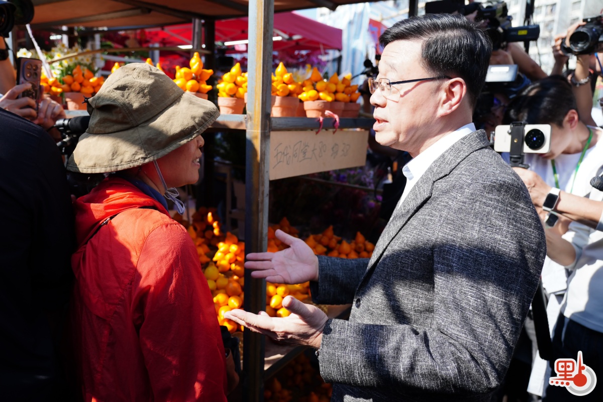 【點新聞報道】今日(16日)年廿九,是團年喜慶的日子。行政長官李家超繼上周歲晚家訪後,今日下午聯同民政及青年事務局局長麥美娟、環境及生態局局長謝展寰等官員,到訪觀塘遊樂場年宵市場,同市民共賀馬年。李家超先花費120元購買銀柳,寓意財富滾滾,後購買價值80元的「五代同堂」,然後掏出100元付款,向商戶說「十全十美唔使找」;再以800元分別購買一束199元和一盆598元的蘭花,祝商戶「大家都發、馬年一路發」。