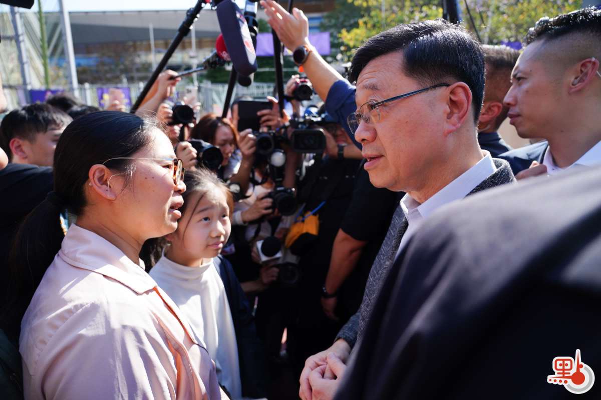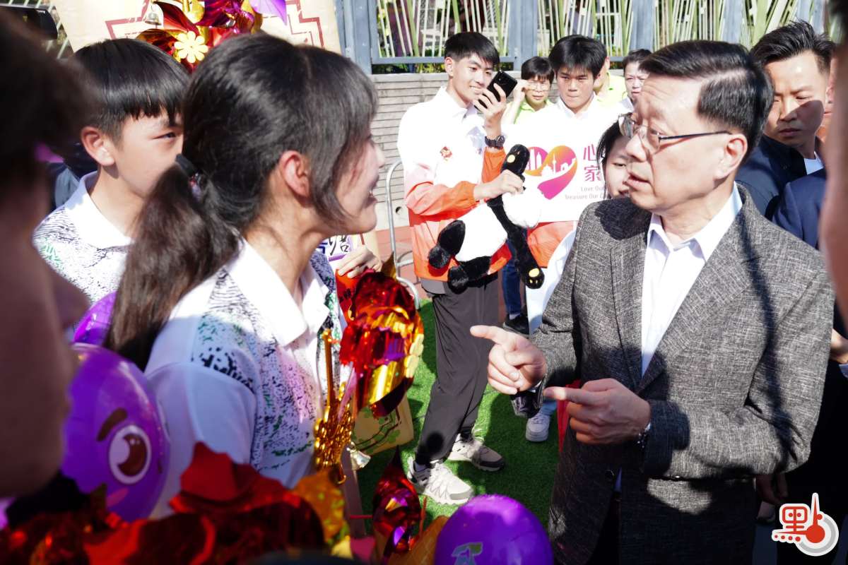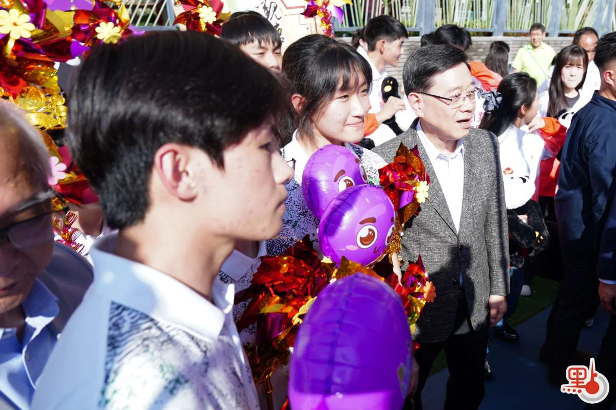 李家超隨後參觀了中華基督教基智中學的學生攤檔,對他們的標語「奔騰不息、自強向前」表示欣賞,形容學生們是社會的未來、希望、「新力軍」,鼓勵他們參與民政及青年事務局的青年工作,又與一眾學生和警方吉祥物「提子」合照。