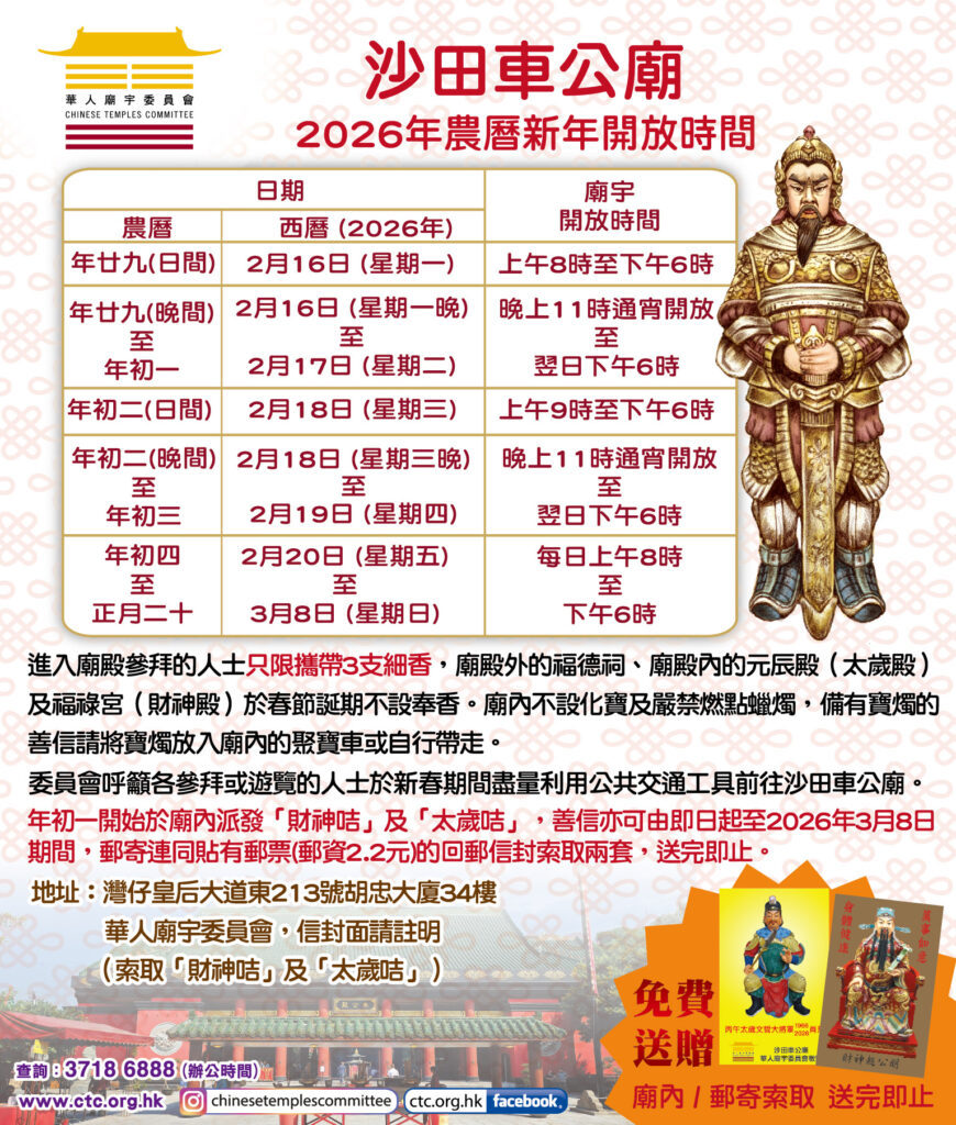 【點新聞報道】農曆新年年廿九(2月16日)至正月二十(3月8日)期間,沙田車公廟將設有特別開放時間,方便善信分流參拜。據華人廟宇委員會最新公告,今晚車公廟將通宵開放。為配合農曆新年期間的車公誕活動,警方表示,將於今晚至2月22日在沙田實施人群管理措施和特別交通安排,呼籲市民及早規劃行程,並盡量使用公共運輸服務。
