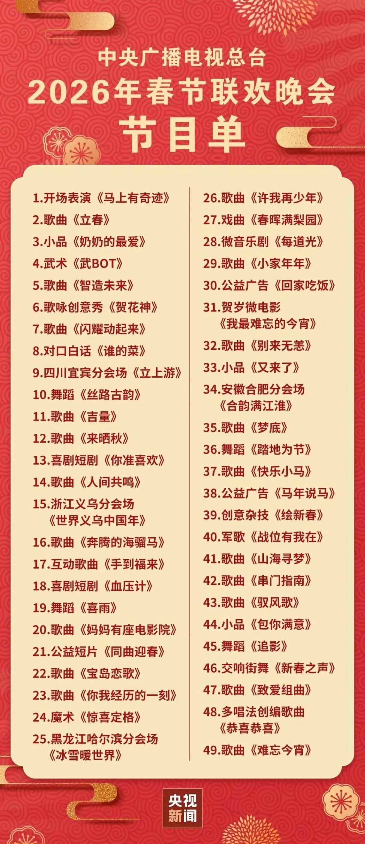 【點新聞報道】據央視新聞報道,2月16日晚8點,中央廣播電視總台《2026年春節聯歡晚會》將在央視綜合頻道、綜藝頻道、中文國際頻道、國防軍事頻道、戲曲頻道、少兒頻道、音樂頻道(無障礙版)、農業農村頻道、4K超高清頻道、8K超高清頻道等10個電視頻道,中國之聲、音樂之聲、經典音樂廣播、文藝之聲、粵港澳大灣區之聲、台海之聲、華語環球廣播、南海之聲和中國交通廣播等9個廣播頻率,以及央視新聞、央視頻、雲聽客戶端、央視網、央廣網、國際在線等6個自有新媒體平台同步直播。
