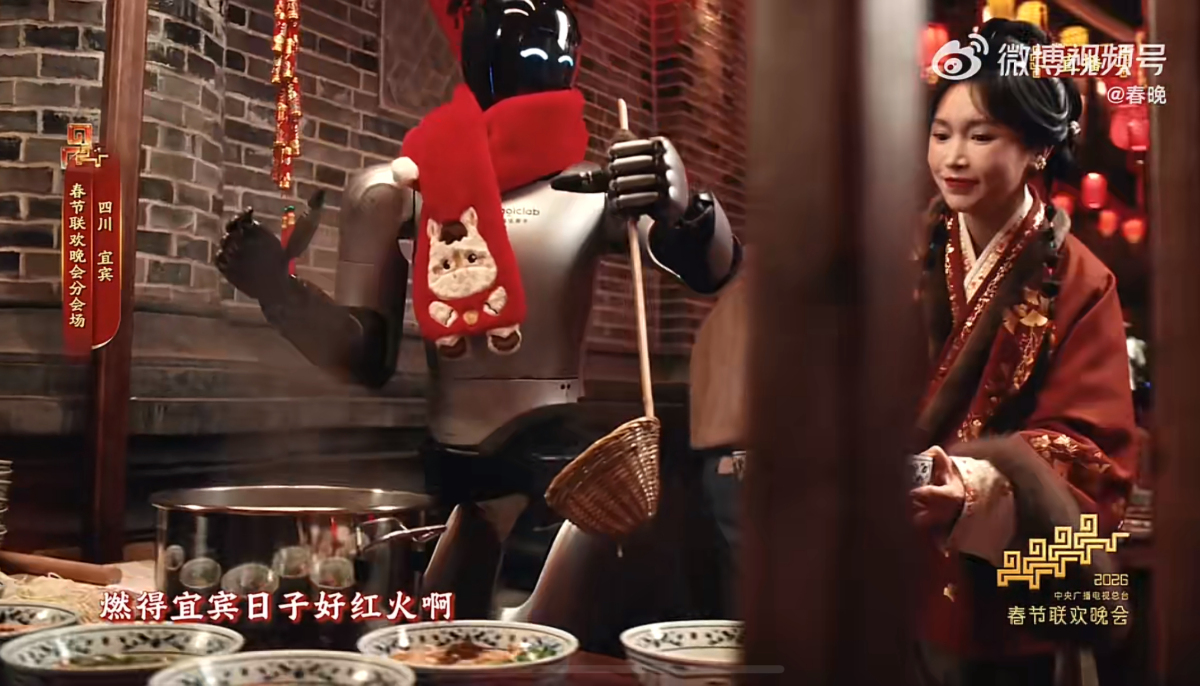 節目中,李子柒更是與機器人同框煮「燃麵」,大為吸睛。節目融合機器人元素與四川新春傳統習俗,既有未來感滿滿的科技元素,也有煙火氣滿滿的宜賓美食元素,突出蜀地「三餐四季,巴巴適適」的鬆弛文化。