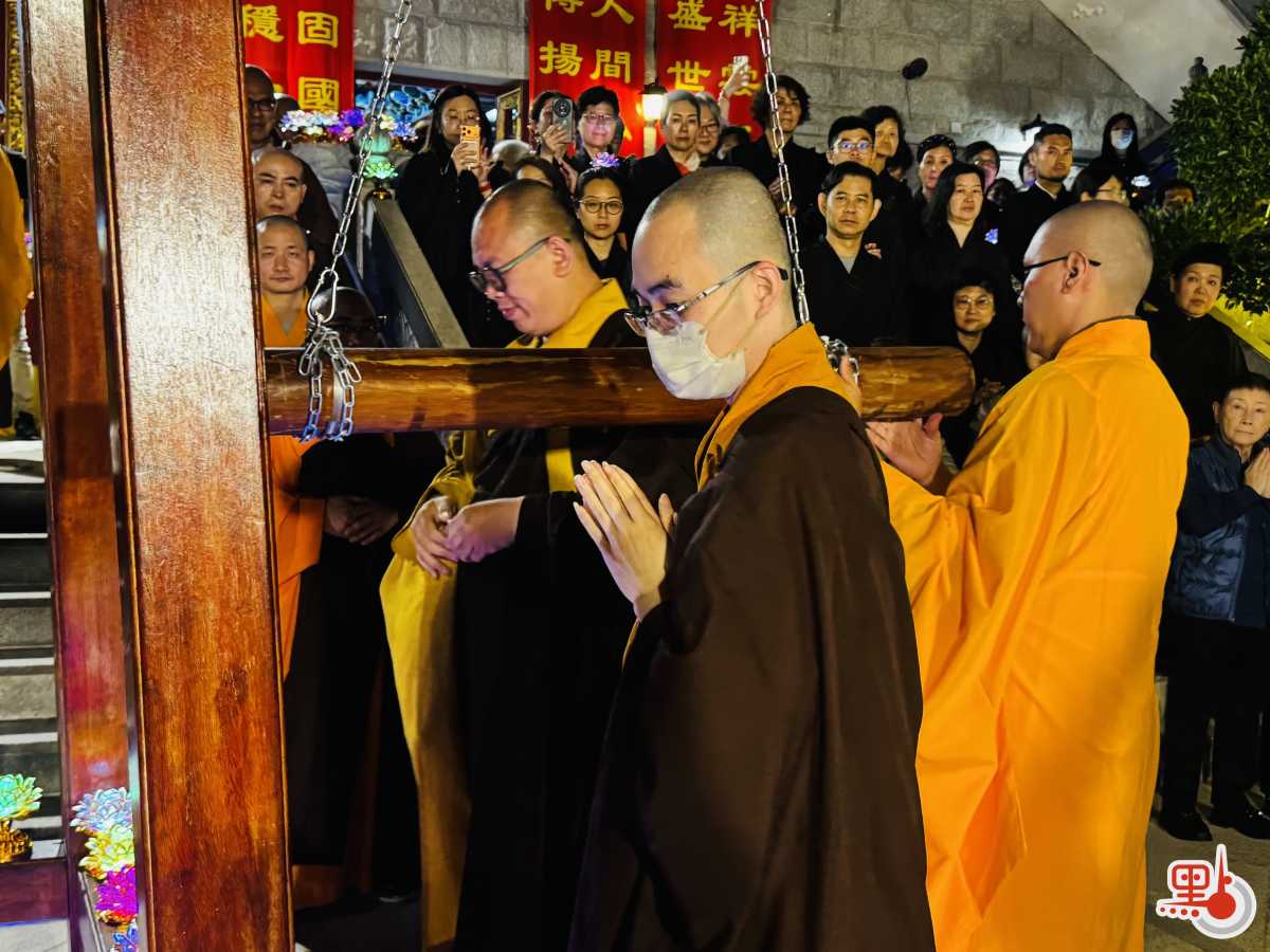 晚間11時37分,叩鐘正式開始。叩鐘前,寬運大和尚帶領大眾至誠祈願,祈願文中一字一句,懇切深沉。踏入午夜11時57分,現場氣氛達到高潮。全場善信在寬運大和尚的帶領下,齊聲倒數:「10、9、8……3、2、1!」當指針指向凌晨零時正,丙午馬年正式降臨,現場歡呼聲與祝福聲此起彼落。寬運大和尚為大眾敲響丙午年的第一聲鐘響,隨後叩鐘開放予在場嘉賓與信眾分組進行。鐘聲持續至凌晨12時20分,在莊嚴的總迴向儀式中,功德圓滿。