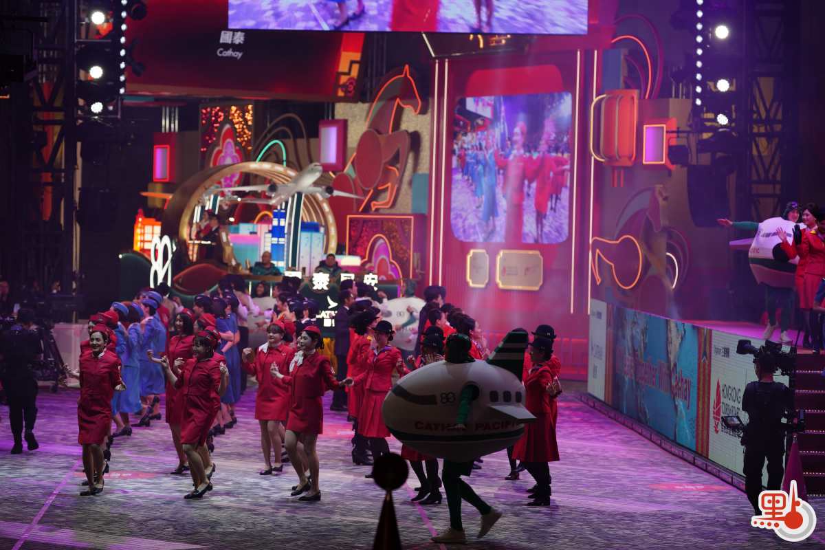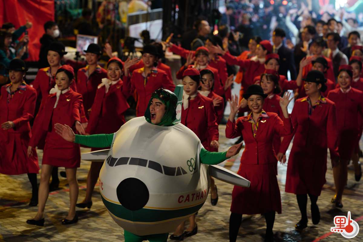 巡演由晚8時開始,80位國泰機組和地勤人員組成的巡遊團隊身着不同時期空中制服,在音樂串燒下大跳勁舞。隨後,「國泰同心飛躍八十年」主題花車率先出發,花車上有「80 YEARS TOGETHER」文字,外形設計則包涵了大量國泰經典元素,其兩款客機在「時空隧道」下穿越時光,寓意國泰與香港共同走過的80年旅程。
