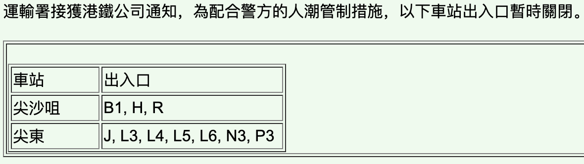 港鐵表示,為配合警方人潮管制措施,尖沙咀B1、H、R;尖東J、L3、L4、L5、L6、N3、P3出入口暫時關閉。