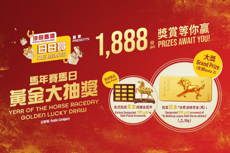 為與馬迷共賀新禧,馬會特別呈獻「馬年賽馬日黃金大抽獎」。獎品豐富,共有1,888份以國畫大師徐悲鴻經典馬匹作品為靈感的馬年典藏藝術品,其中大獎更是約50克足金999擺件,極具收藏價值與吉祥寓意。入場人士只需在指定時間前完成登記,即有機會贏取這份別具意義的賀歲大禮。此外,每位入場觀眾更可免費領取限定「財來運起風車筆」,將開運風車的概念帶回家中,既實用又富有儀式感。