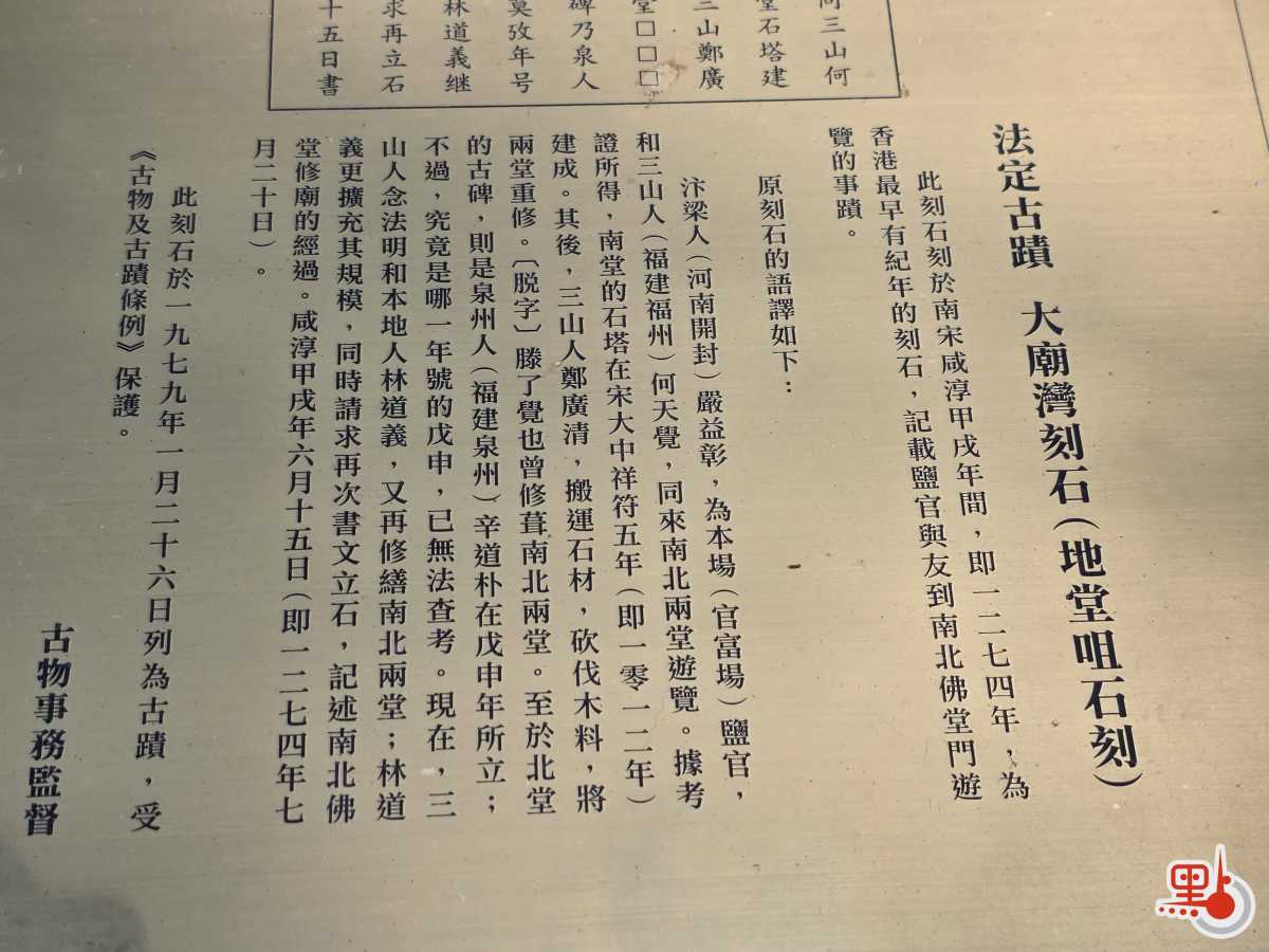 佛堂門天后古廟旁邊的宋朝石刻,又稱大廟灣刻石,刻於南宋咸淳甲戌年間,即1274年,為香港最早有紀年的刻石,記載鹽官與友到南北佛堂門遊覽的事跡,以及這處兩所廟宇的歷史。大廟灣刻石於1979年列為古蹟。