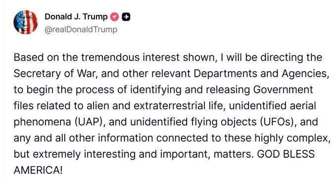 【點新聞報道】當地時間2月19日,美國總統特朗普在社交媒體發帖稱,鑒於公眾「表現出巨大興趣」,他將指示戰爭部長(國防部長)赫格塞思及相關部門與機構,着手啟動識別並公開與外星人、地外生命、不明空中現象(UAP)以及不明飛行物(UFO)相關的政府文件。
