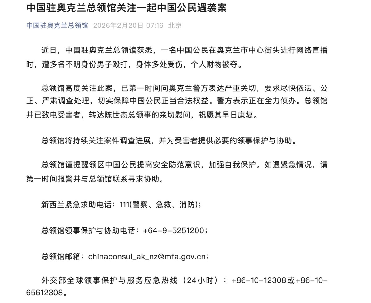 總領館高度關注此案,已第一時間向奧克蘭警方表達嚴重關切,要求盡快依法、公正、嚴肅調查處理,切實保障中國公民正當合法權益。警方表示正在全力偵辦。總領館並已致電受害者,轉達陳世傑總領事的親切慰問,祝願其早日康復。總領館將持續關注案件調查進展,並為受害者提供必要的領事保護與協助。
