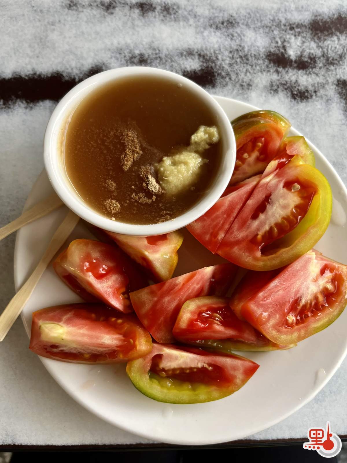 眾多小吃裏,最讓我難忘的,是台南人津津樂道的「古早味番茄切盤」。一整顆番茄切成厚實的瓣狀排在白瓷盤裏。旁邊是一碟看似普通,實則暗藏玄機的沾醬——醬油膏裏拌着砂糖,再堆上一小座細細剁碎的薑蓉。初看覺得怪異,入口卻是驚喜。醬油的鹹鮮裏滾着砂糖未全融化的顆粒感,薑的辛辣在舌尖竄動,番茄本身的酸與果香把這一切兜在一起。甜、鹹、辣、酸同時在口腔裏綻開,清爽又過癮。