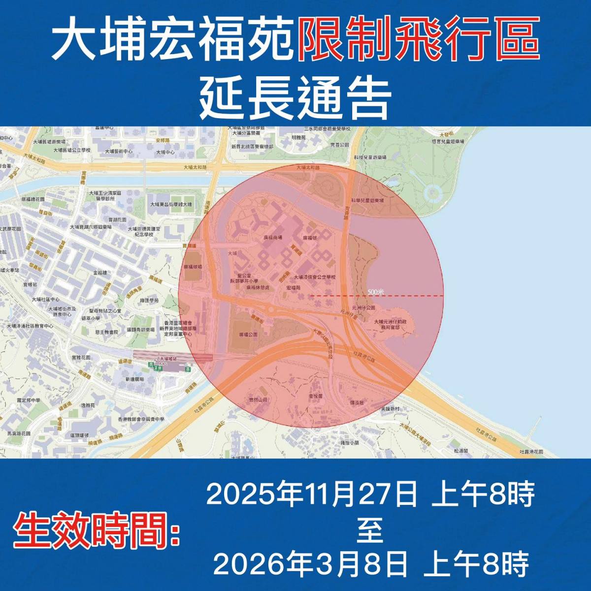 【點新聞報道】警方昨日(20日)表示,鑒於公眾安全,警務處在大埔宏福苑範圍已設立「限制飛行區」。時間將會由2026年2月22日上午8時延長至2026年3月8日上午8時。
