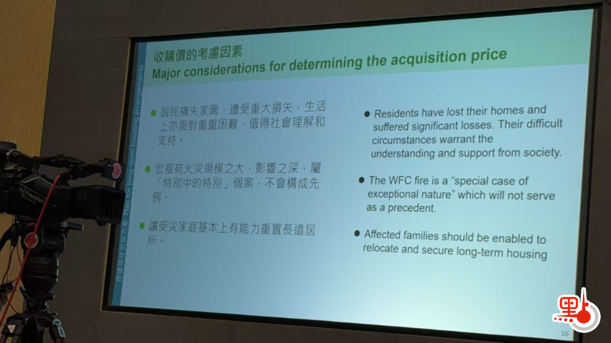 黃偉綸指出,由於目前沒有任何有效的市場機制可以幫助受災的住戶,政府因此提出用現金或者「以樓換樓」的方式收購宏福苑這7座所有單位的業權,這個方案可以最快且最靈活地解決受災業主住戶的長期居住需求,而政府成為單位的業權人之後,將承擔並處理各種法律和保險事宜方面的風險。