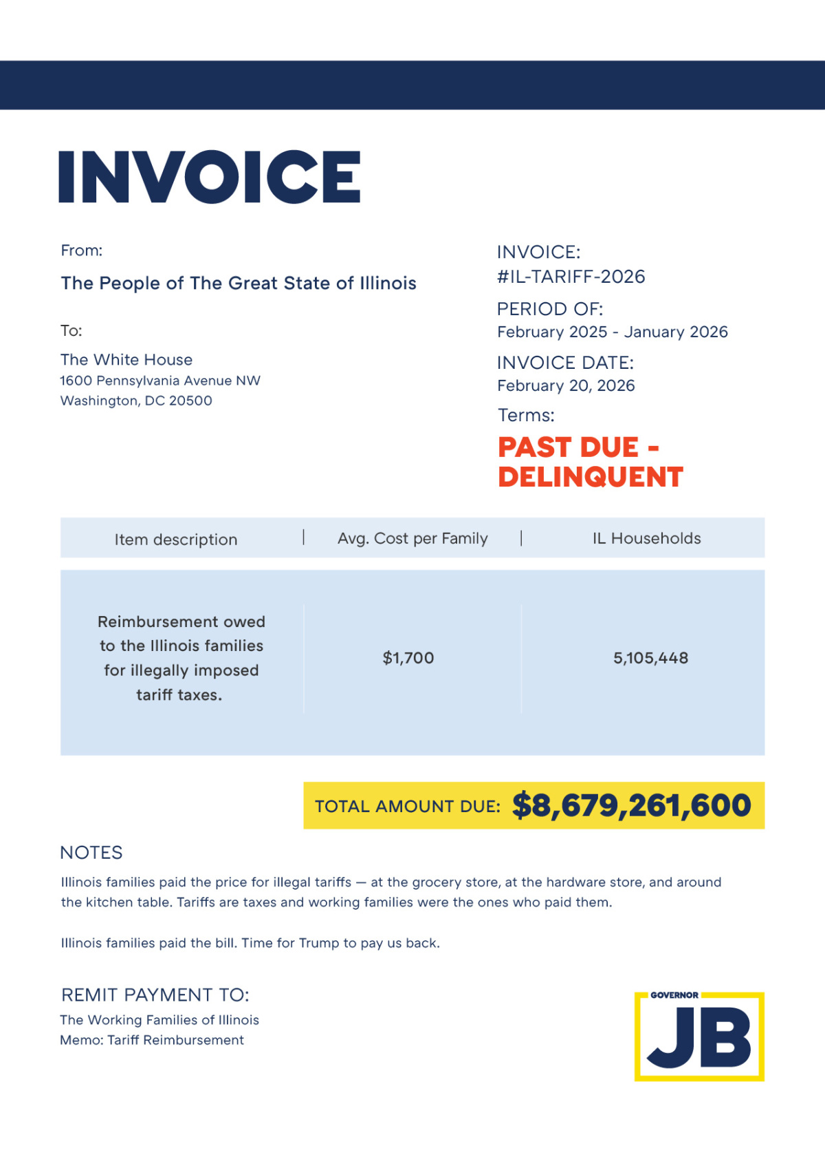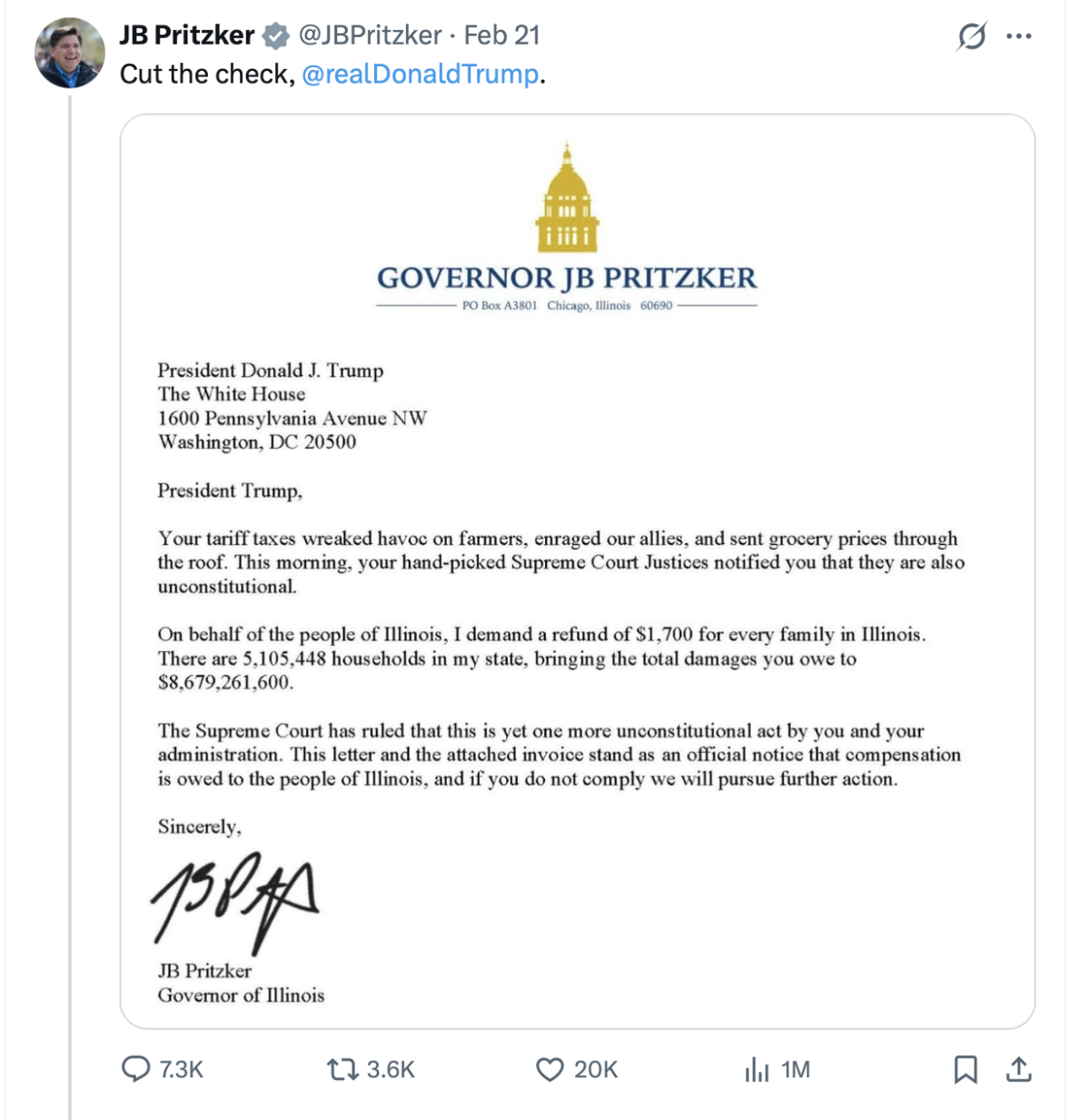 【點新聞報道】美國伊利諾伊州州長、民主黨人普里茨克21日致函美國總統特朗普,要求為該州每個家庭退還1700美元關稅,退稅總額約87億美元。普里茨克在社交媒體發布了相關的賬單,並配文「請付款」。