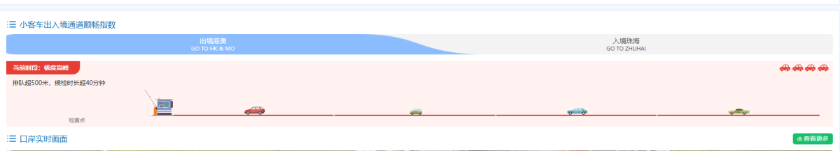 【點新聞報道】內地春節黃金周進入尾聲,各地迎來返程高峰。今日(22日)下午約5時20分,據實時通關網頁顯示,港珠澳大橋珠海口岸(往香港方向)小客車出入境通道順暢指數已達到「極度高峰」,車輛排隊超過500米,候檢時長超過40分鐘。
