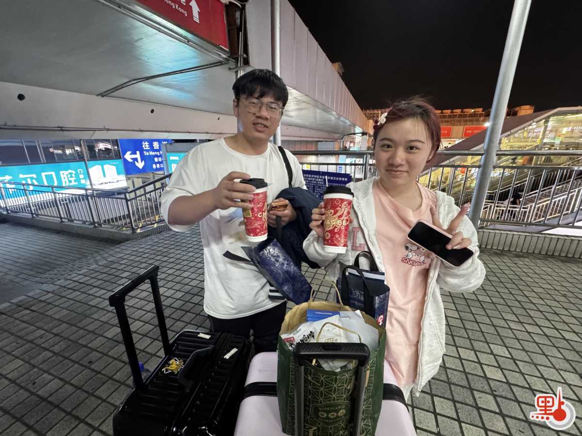 談起這次內地之行,他們大讚內地購物和遊玩的方便。他們在深圳玩了三天,又到廣州玩了三天,特別提及深圳東門「很熱鬧,也很方便」,還體驗了內地的按摩,「價格比台灣便宜很多」。被問及是否購買特產,他們展示了手中的奶茶和滷味鴨貨,行李箱裏還帶回了袋裝螺螄粉。