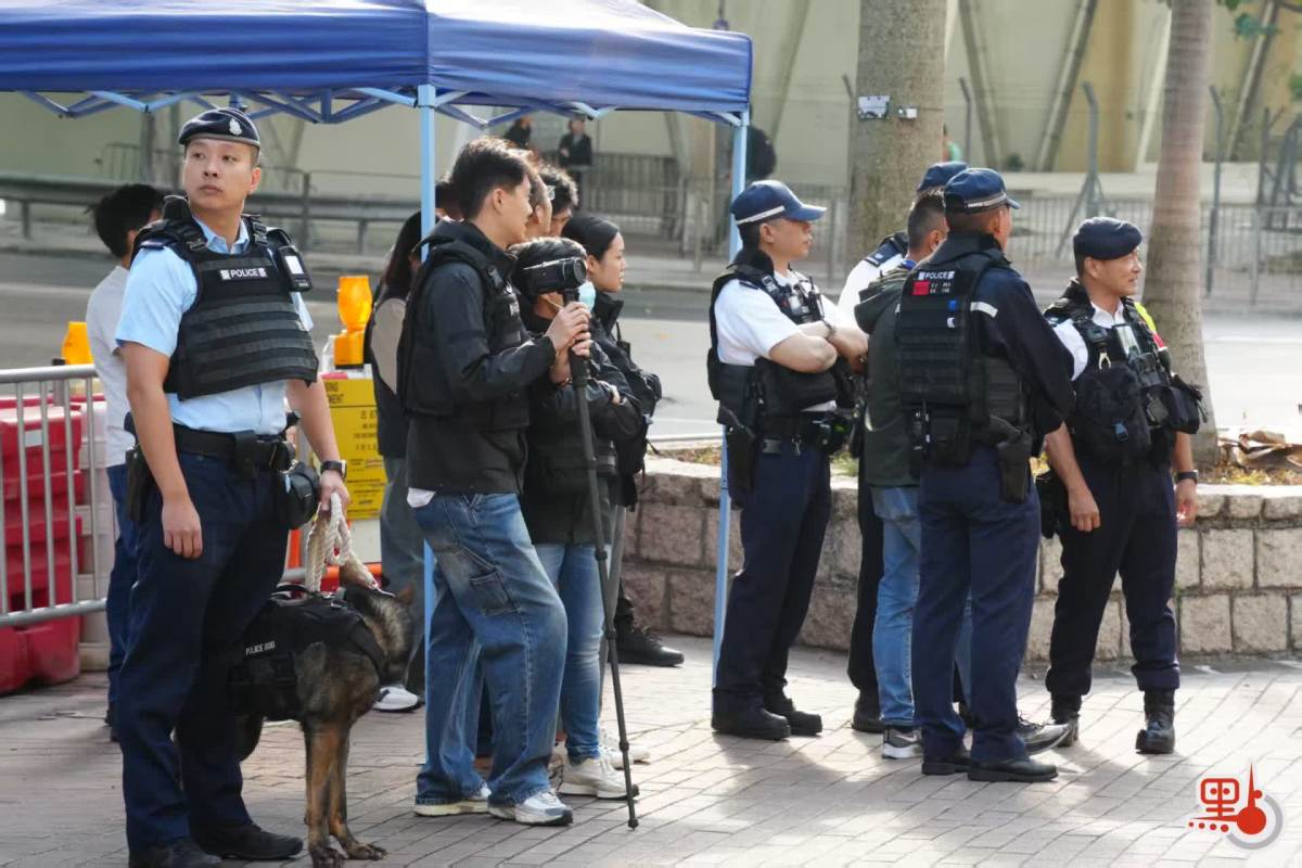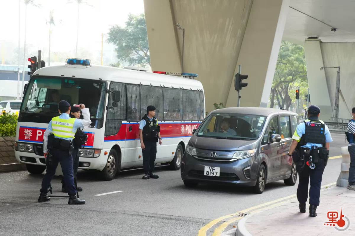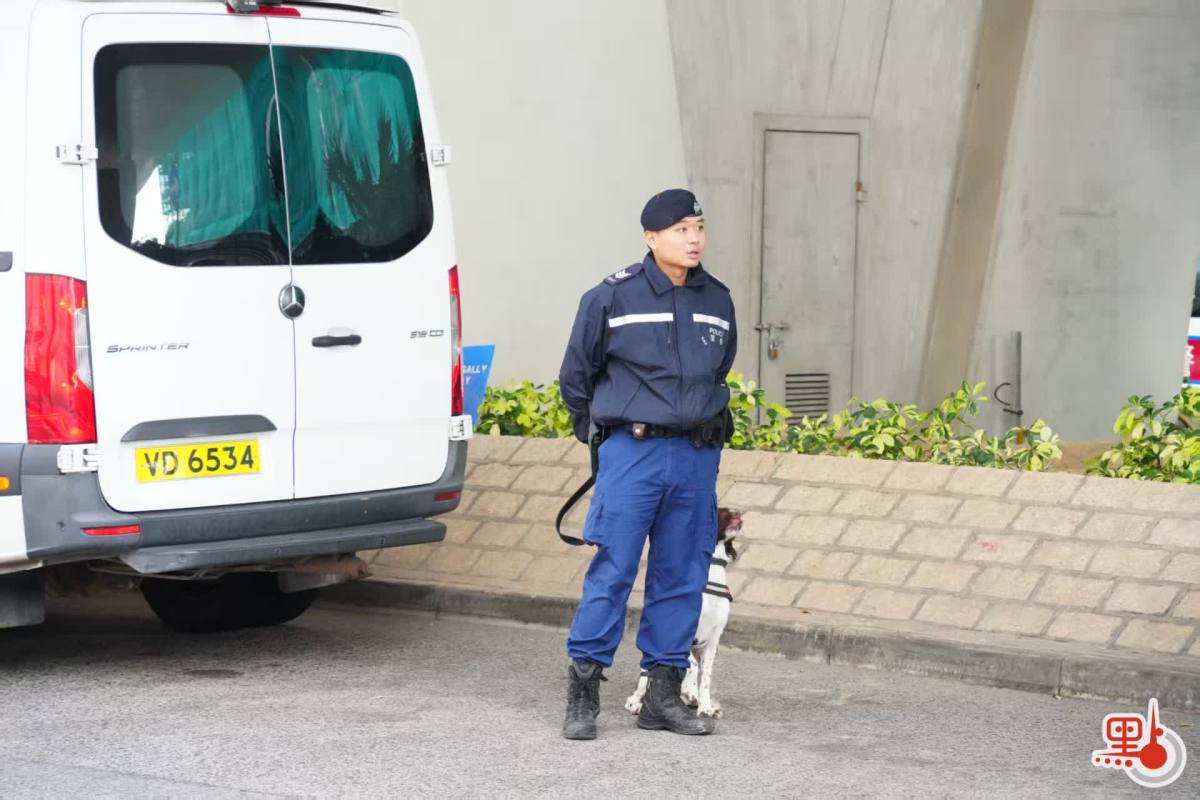 點新聞記者今早見到,法院門外有多名穿着防刺戰術背心的警員在場巡邏,而位於通州街天橋底的行車線亦停泊多架警方車輛。與此同時,警方設置路障,所有進入法庭的車輛,必須需接受安檢,例如,通過爆炸品搜索犬、金屬探測儀器以及反光鏡檢查車底。