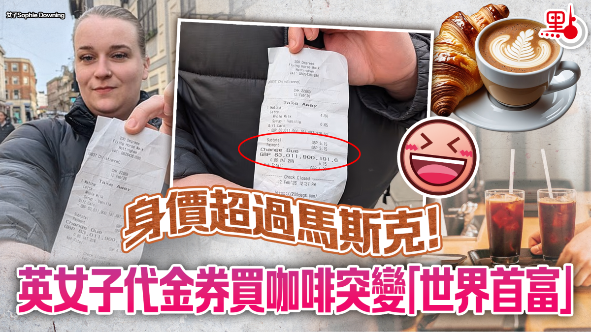 【點新聞報道】英國一名29歲的女子,在使用代金券買咖啡後,收據上的餘額卻突變成6.3萬兆英鎊(約66.6萬兆港元),這意味着她的身價比世界首富馬斯克還要多10萬倍。