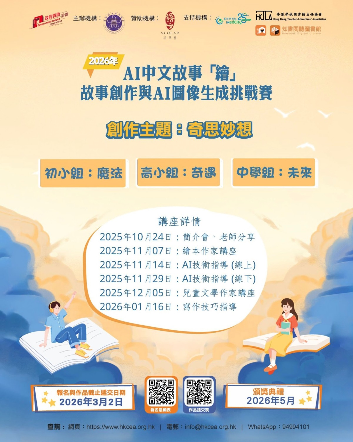 香港語文菁英協會主辦「2026年AI中文故事『繪』——故事創作與AI圖像生成挑戰賽」,期望學生能藉此挑戰,揮灑創新故事的筆觸,並運用AI技術賦予故事生動的視覺形象,學生不但能一展寫作和創新的才能,更能使用新科技提升應用語文的實踐能力,開拓AI與語文學習的無限可能。