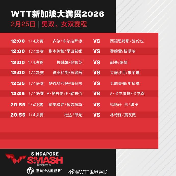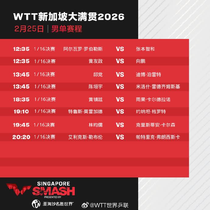 【點新聞報道】在昨日(24日)進行的WTT新加坡大滿貫賽爭奪中,男、女單打決出16強部分席位,多名國乒選手順利晉級。王楚欽、王曼昱等國乒五將率先晉級單打16強,林詩棟/黃友政、蒯曼/陳熠成功晉級雙打8強。今日(25日),比賽進入正賽第四天,孫穎莎、蒯曼、向鵬、陳垣宇等將出場。具體賽程如下: