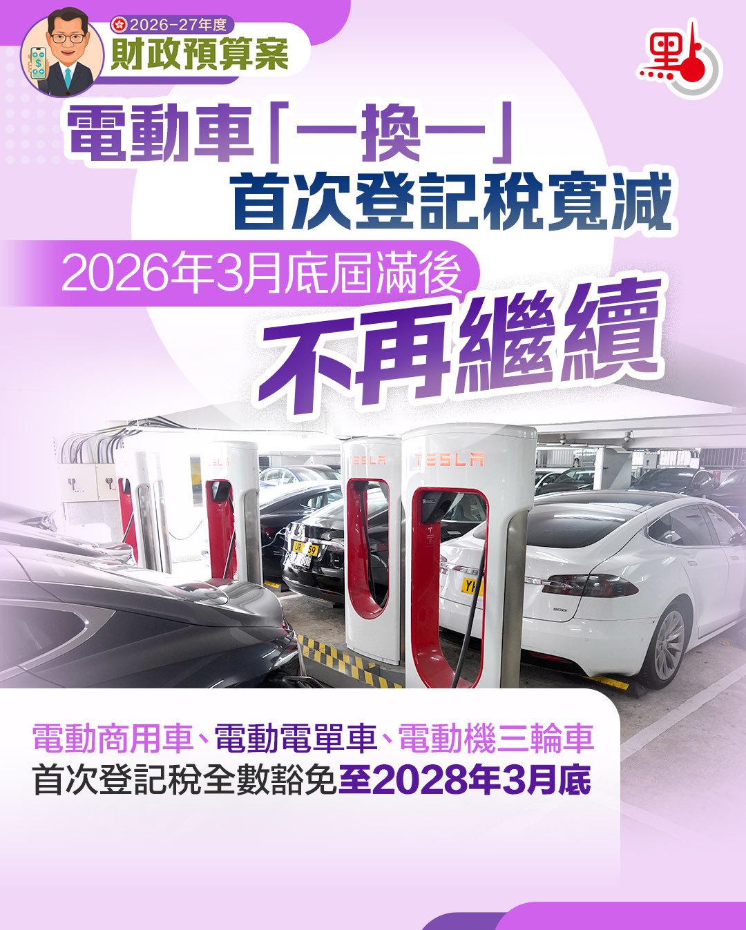 陳茂波表示,當局會繼續推動電動車的使用。電動商用車、電動電單車和電動機三輪車的首次登記稅繼續獲全數豁免至2028年3月底。考慮到現時電動私家車技術成熟、供應充足、車款選擇增加和價格逐漸下調,電動私家車已具備市場競爭力,電動私家車的首次登記稅寬減安排在3月底屆滿後不再繼續。