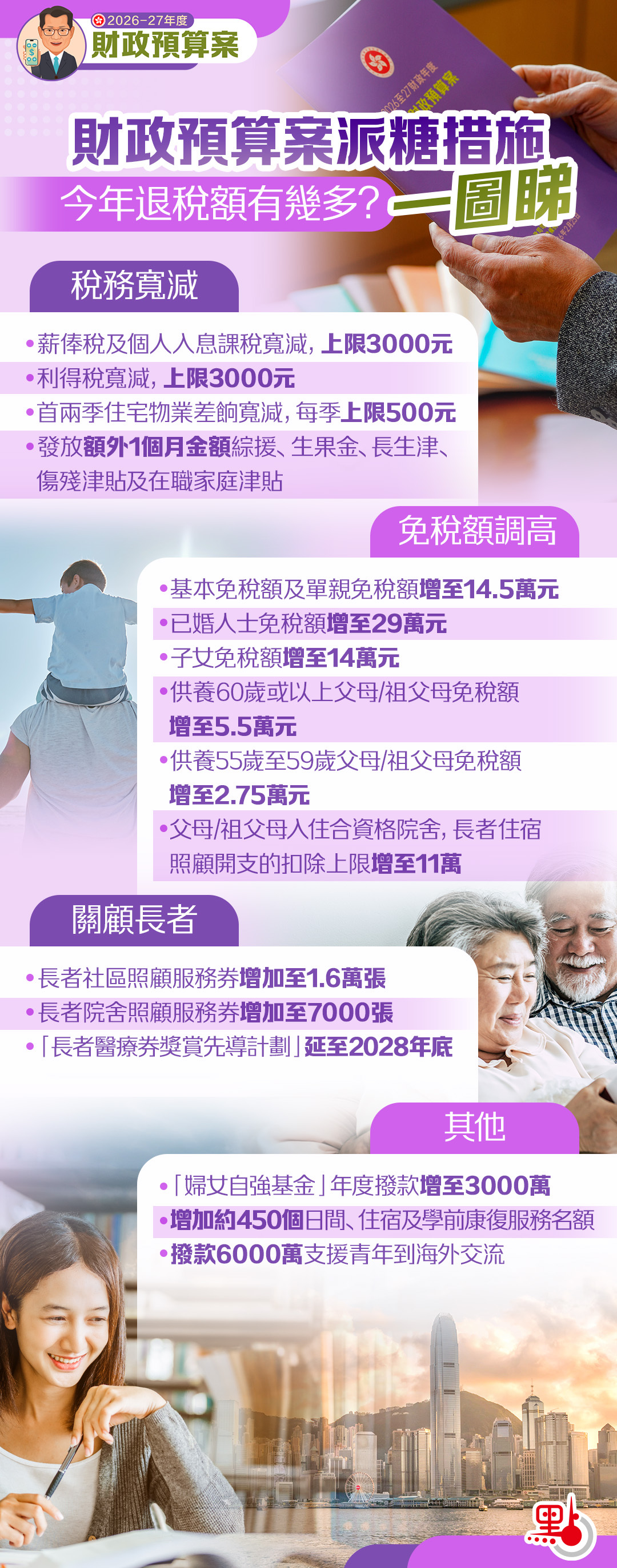 此外,基本免稅額及單親免稅額由13.2萬元增加至14.5萬元,子女免稅額及額外子女免稅額亦由13萬元增加至14萬元。