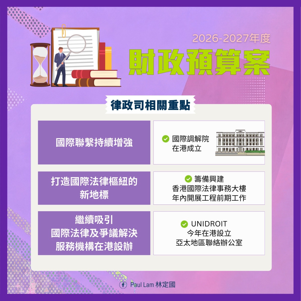 【點新聞報道】財政司司長陳茂波今日(25日)早上發表2026/27年度《財政預算案》。律政司司長林定國在社交平台發文,表示會全力配合落實預算案內容,並主動對接國家「十五五」規劃。律政司會用好「一國兩制」下的獨特優勢,透過多個重點項目進一步完善以普通法制度為基礎的「國際化、高水平、信譽好」的法律服務和相關配套,為國家發展提供所需法治保障,並在國家涉外法治體系和能力建設中發揮更積極的作用。