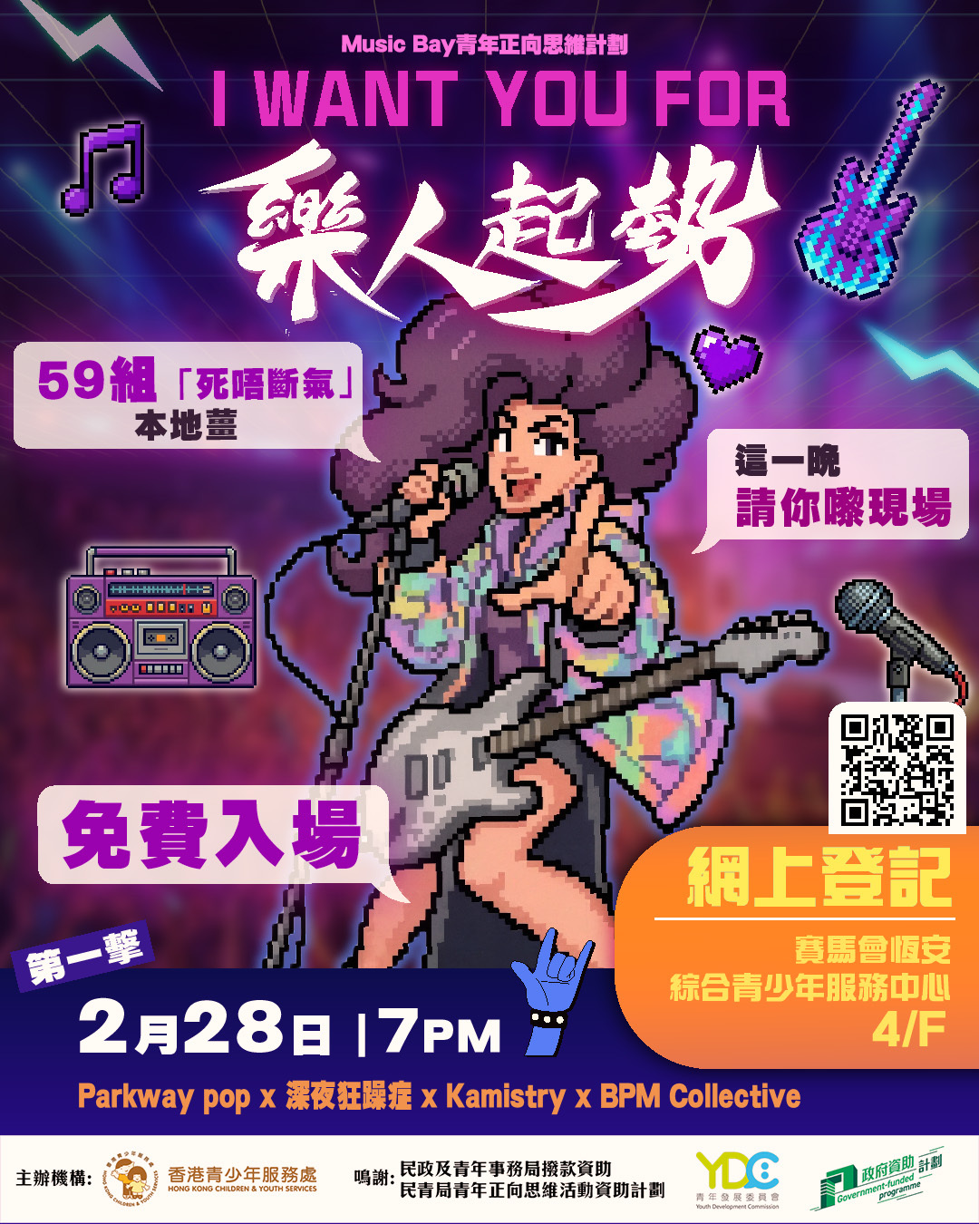 【點新聞報道】由香港青少年服務處主辦,民政及青年事務局及青年發展委員會撥款資助「民青局青年正向思維活動資助計劃」下的「Music Bay青年正向思維計劃」,宣布旗下核心地區活動「樂人起勢」將於農曆新年後展開。計劃由2026年2月起至2027年1月,集結59組本地音樂單位,連續12個月舉行馬拉松式免費音樂Showcase。