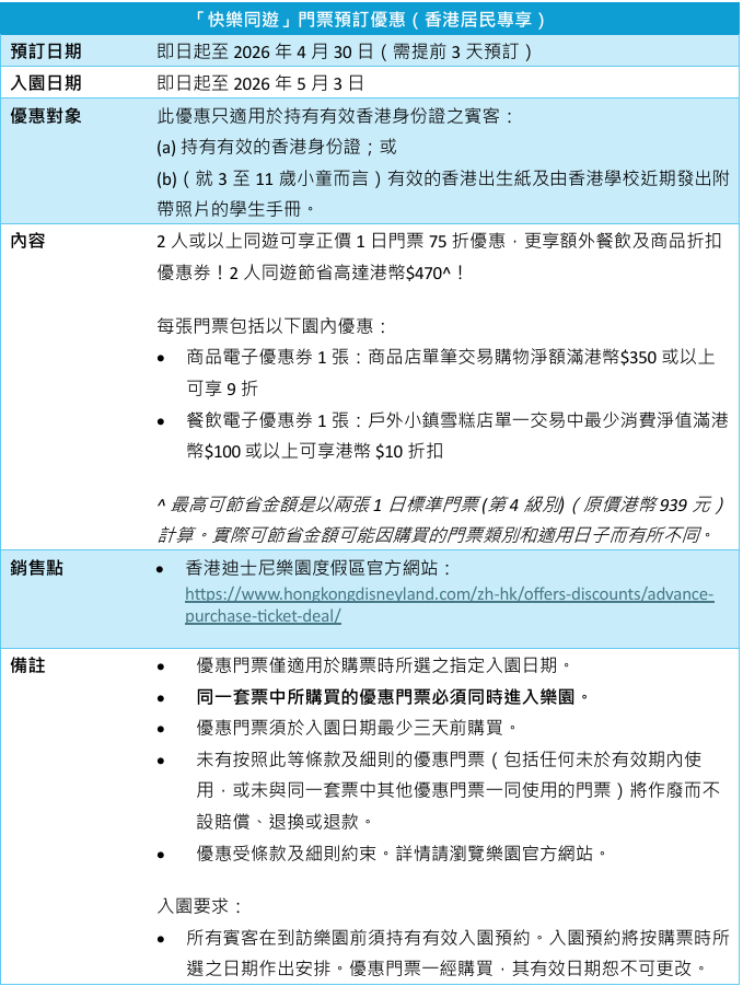 即日(2月25日)起至5月3日期間選定日子入園,2位或以上的香港居民同遊可以專享「快樂同遊」門票預訂優惠:正價1日門票75折,並獲額外餐飲及商品折扣優惠券;二人同遊可節省高達港幣$470。迪士尼亦推出限時門票升級優惠:以正價9折成為「奇妙處處通」會員,與Duffy和好友共度全年奇妙時光。