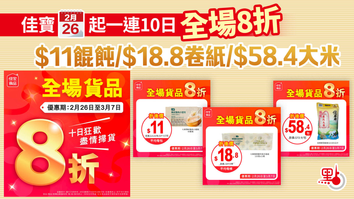 【點新聞報道】明日(26日)起,佳寶「快閃優惠」8折獻禮與你狂歡10日,筍貨好貨盡在佳寶,拉車仔埋嚟盡情掃貨。無論係新鮮蔬果、肉類海鮮,定係你鍾意嘅雜貨、飲品,佳寶全都有。