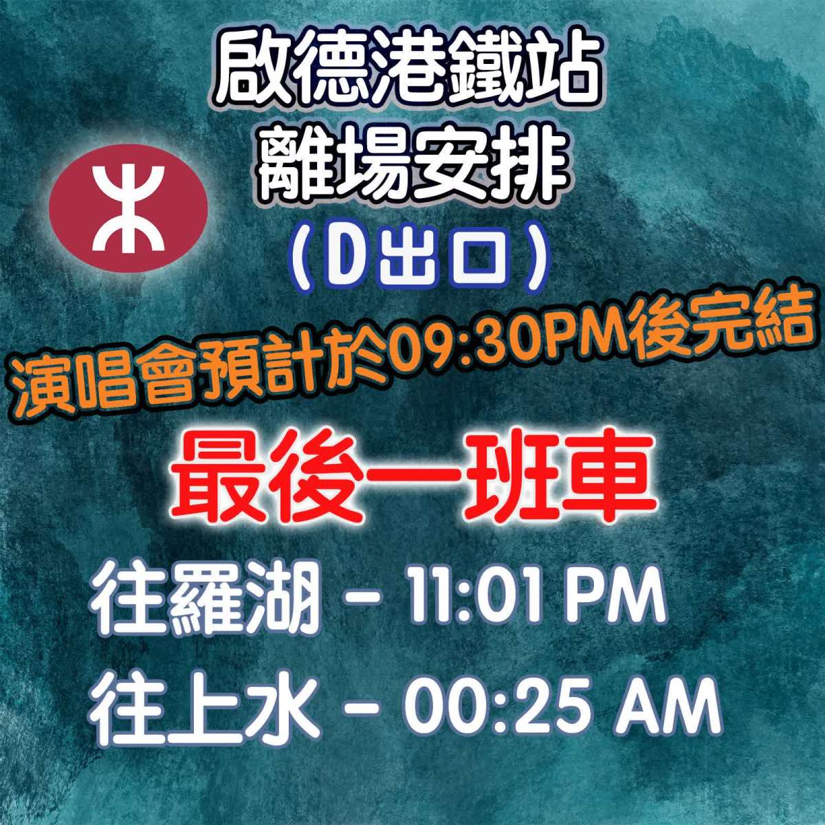 由於演出在06:00PM開始,預計09:30PM後結束。觀眾可選擇在港鐵宋皇臺站或啟德站搭乘往羅湖方向的列車外,亦可選乘港鐵往上水方向,或搭乘巴士路線SP12前往新田。