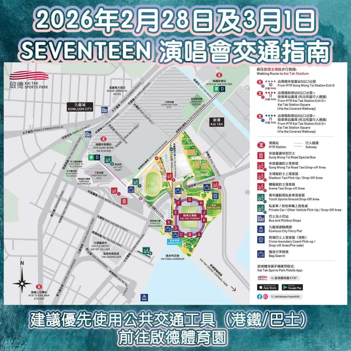 - 建議優先使用公共交通工具(港鐵/巴士)前往啟德體育園