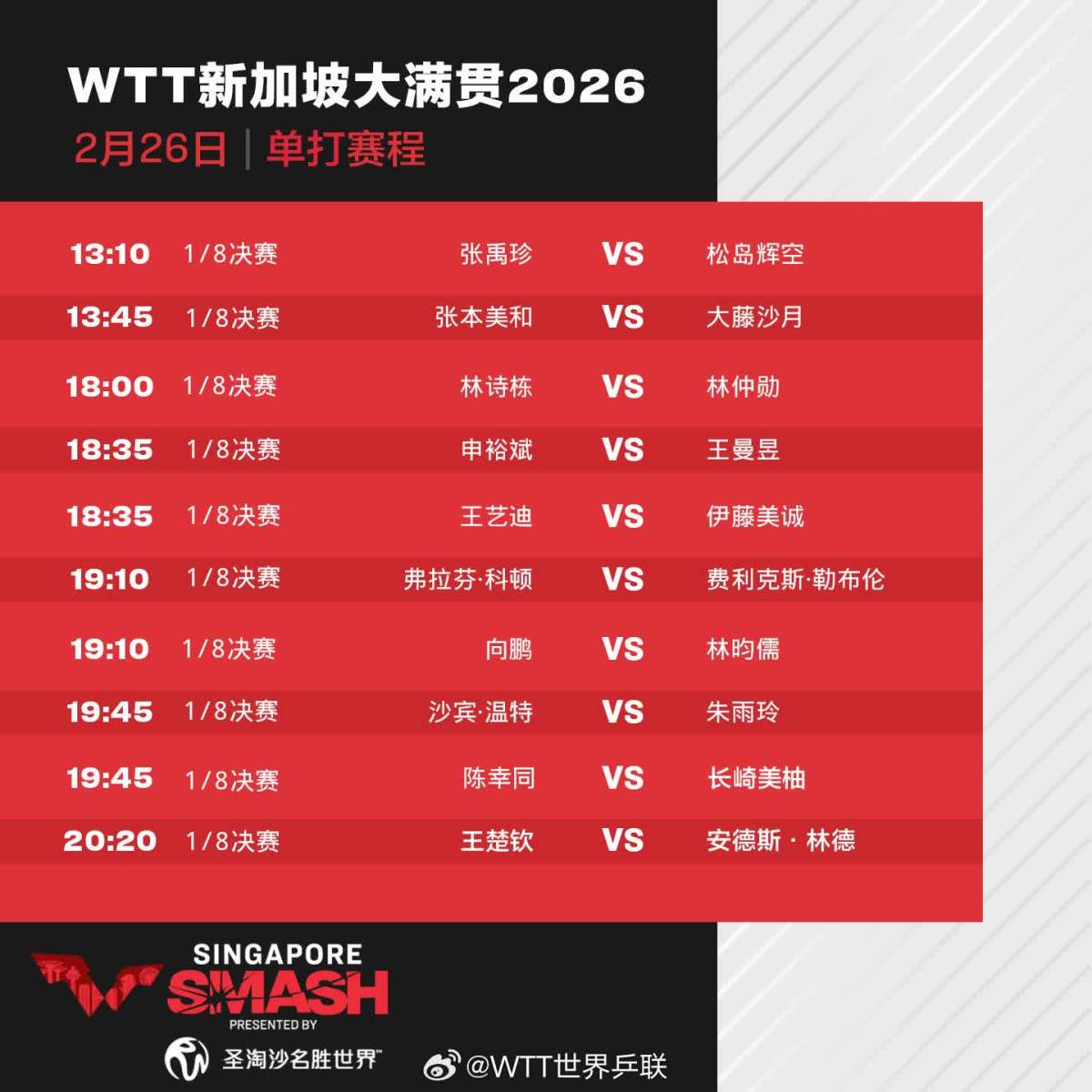 【點新聞報道】2026年WTT新加坡大滿貫精彩繼續,經過4個正賽日的爭奪,孫穎莎、王曼昱、王楚欽等11名國乒選手晉級單打16強。今日(26日)將進行男女單打1/8決賽及雙打半決賽,其中將上演3場「中日對決」,包括王藝迪迎戰伊藤美誠、陳幸同迎戰長崎美柚;女雙方面,蒯曼/陳熠組合將對上張本美和/早田希娜。