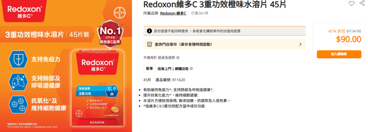 萬寧今日出位價維多C 3重功效橙味水溶片45片低至$90/件,每片含1000毫克維他命C、400國際單位維他命D及10毫克鋅。