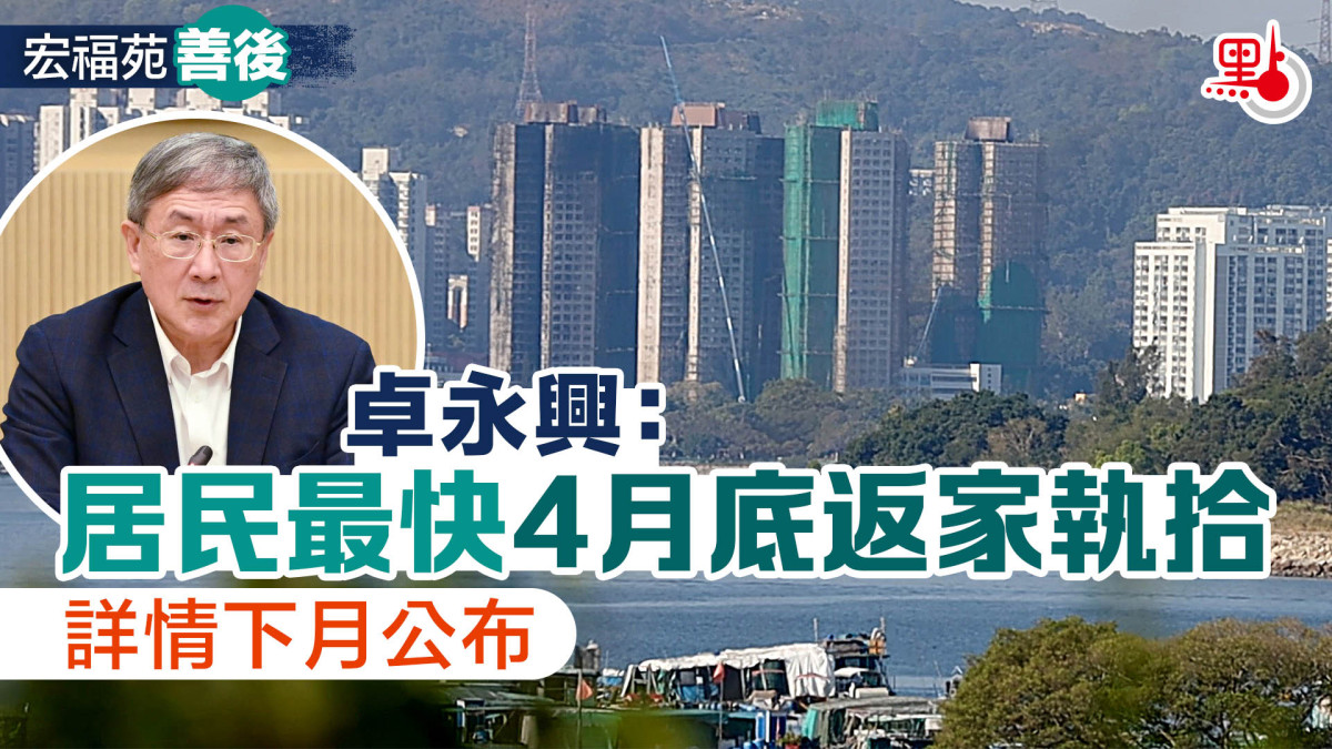 卓永興表示,明白宏福苑居民希望上樓查看,認為必須在安全的情況下進行,例如確保天花、牆身等狀況安全,由於牽涉1700多戶,上樓安排規模大、難度高,需要充分部署和進行大量前期工作,需要大約2個月時間準備,預計最快4月底可安排居民分批上樓,詳情下月公布。