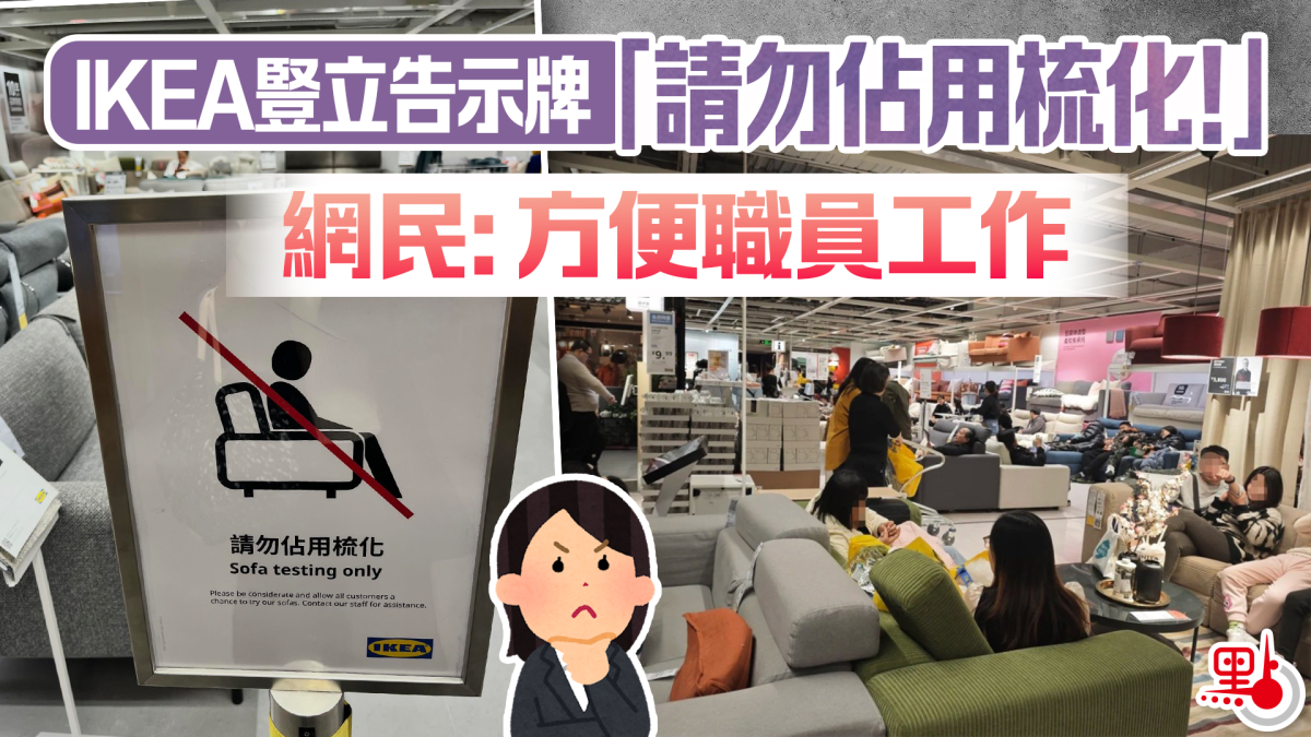 有網民稱,IKEA從去年起就開始打擊「長佔」行為,例如在銅鑼灣分店就設有梳化專員「趕鴨仔」:「專門趕走過嚟坐同瞓嘅人,每5分鐘成隊人好似趕鴨仔咁」、「叫人繼續往前行,留返啲凳比其他人試坐」。