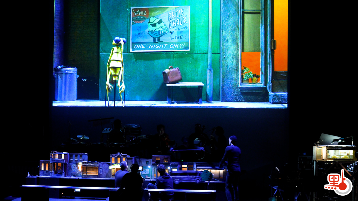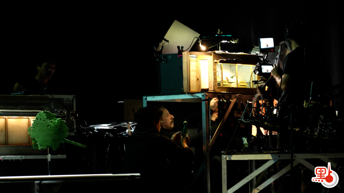 運動靈活的戲偶、現場樂隊、變幻的光影……以上種種元素在舞台上配合得嚴絲合縫,共同構成《蚊仔發「樂」夢》這次「跨界藝術的嘗試」。戲偶設計師派翠克・馬特爾告訴我們,雖然演出的主要呈現形式是一場電影,但其實各種媒介都在其中發揮着作用,觀眾在螢幕上看到的一切,都在舞台上的某處發生——「可能是用木偶、用手,攝影機或音樂。甚至剪輯師菲爾需要在拍攝時進行現場剪輯。」