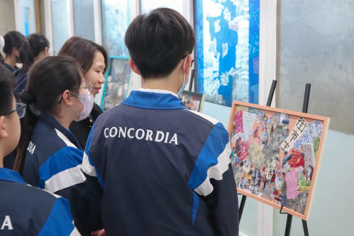 另一位同學劉韻虹則透過拚貼手法重現基隆街排檔,她認為這次學校活動讓他學會了「感恩」:「畫中古人為了生活奔波,跟現在的街坊一樣努力。雖然相隔千年,但那種守望相助的人情味沒變。這讓我學會珍惜這份獨特的社區價值,也明白身為社區一分子的公民責任。」
