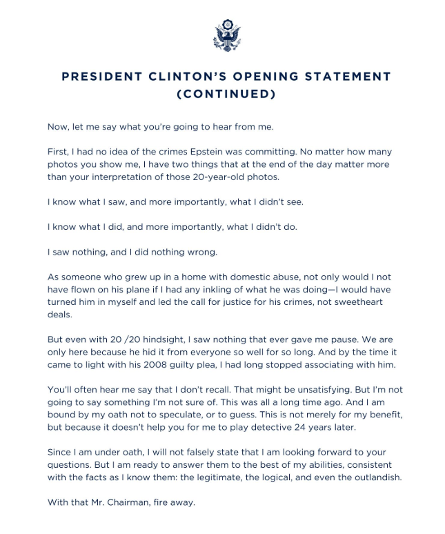 在眾議院監督與政府改革委員會作證前,克林頓發布開場聲明,否認曾知曉愛潑斯坦的犯罪行為,並表示若當時有任何跡象,「不僅不會搭乘他的飛機,還會親自舉報並帶頭呼籲為受害者伸張正義」。