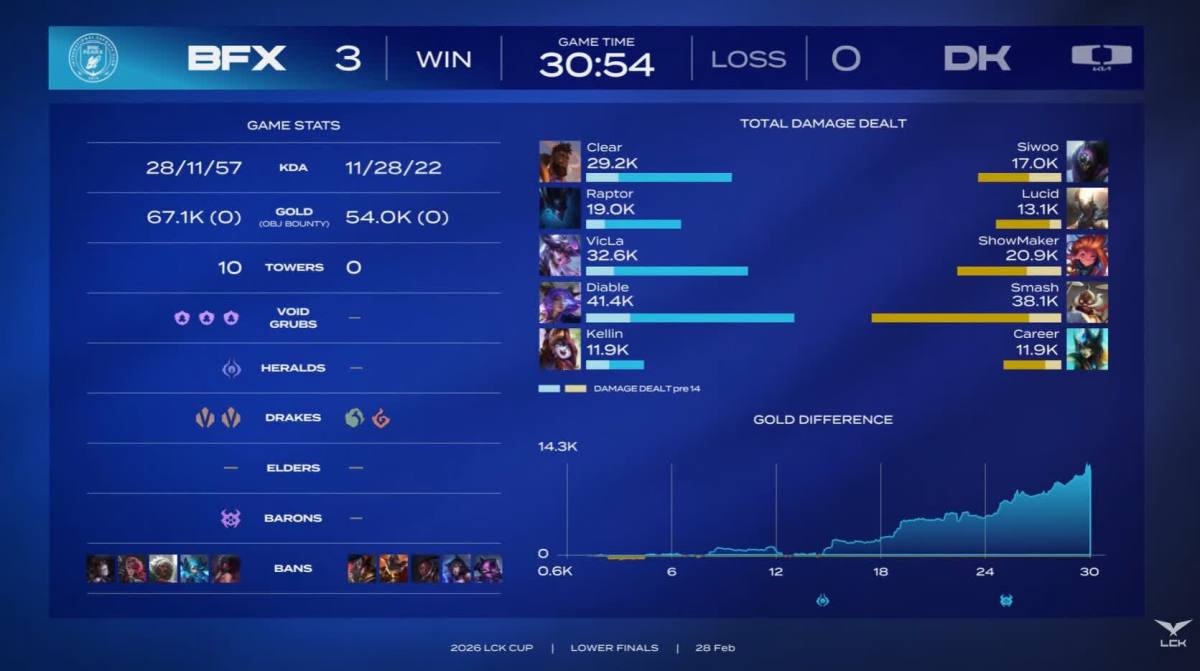 【點新聞報道】今日(2月28日)晚間,在中國香港啟德體藝館舉行的2026LCK盃決賽晉級賽中,BNK FearX(BFX)以3比0的完美比分橫掃Dplus KIA(DK),不僅成功闖入決賽,更鎖定了即將在巴西舉辦的2026 First Stand賽事入場券。明日(3月1日),BFX將與Gen.G爭奪2026LCK盃的最終冠軍榮耀。