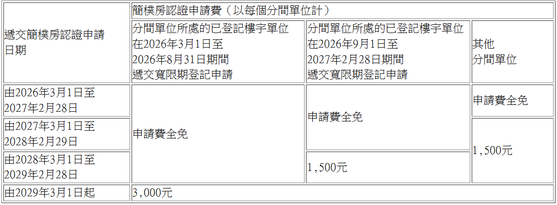 在簡樸房制度下,分間單位須符合居住環境最低標準,並取得簡樸房認證,日後方可合法出租作居住用途。為鼓勵分間單位業主/營運人盡早遞交登記和認證申請,政府就認證申請費提供「早鳥」減免優惠,即早登記早申請的話,申請費便可全免。