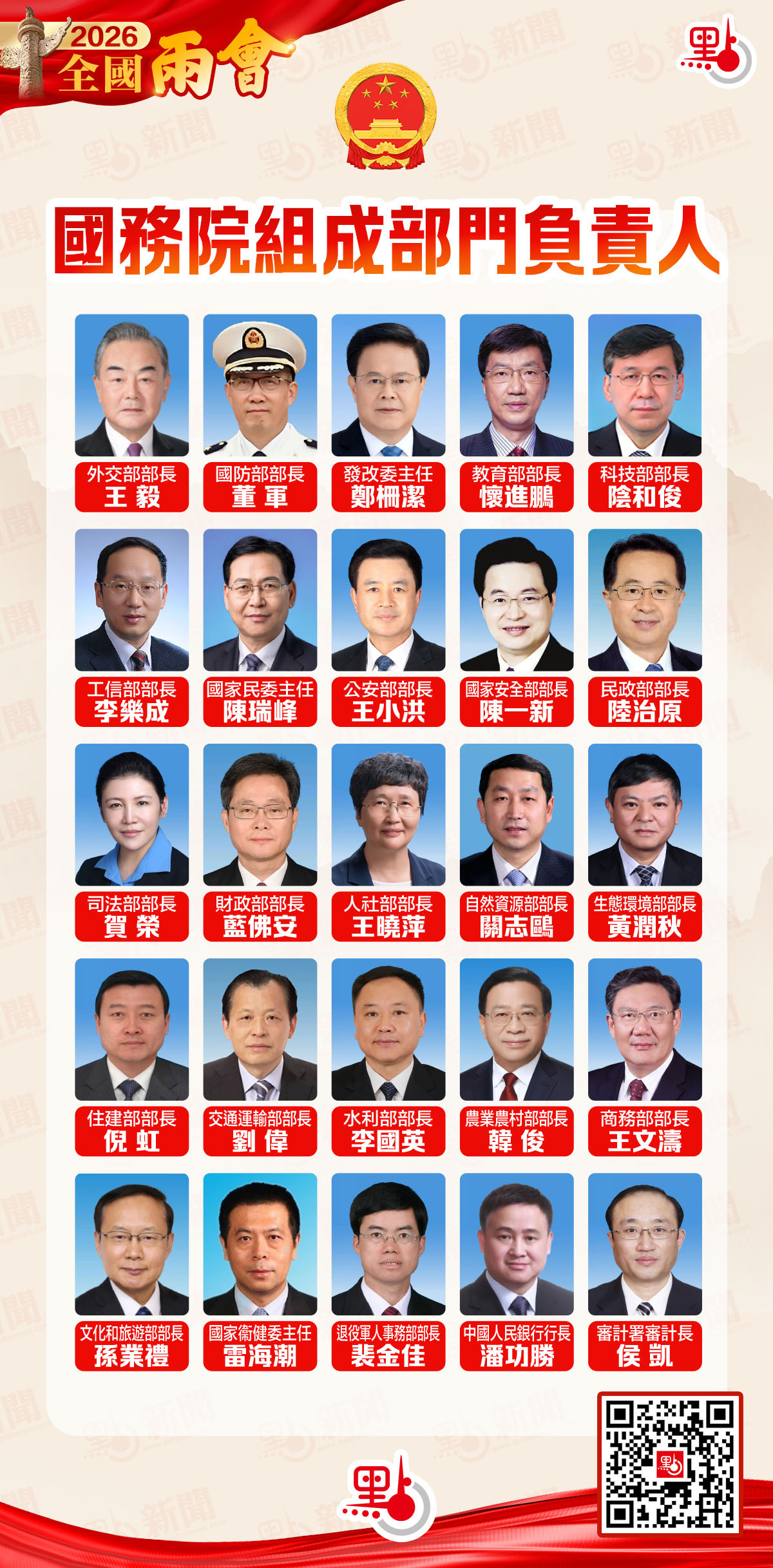 【點新聞報道】2026年全國兩會即將召開,十四屆全國人大四次會議將於3月5日開幕,全國政協十四屆四次會議將於3月4日開幕。為了方便讀者認識可能出現在兩會記者會或「部長通道」的國務院組成部門主要領導,點新聞整理了《國務院組成部門負責人最新名單》,敬請關注。