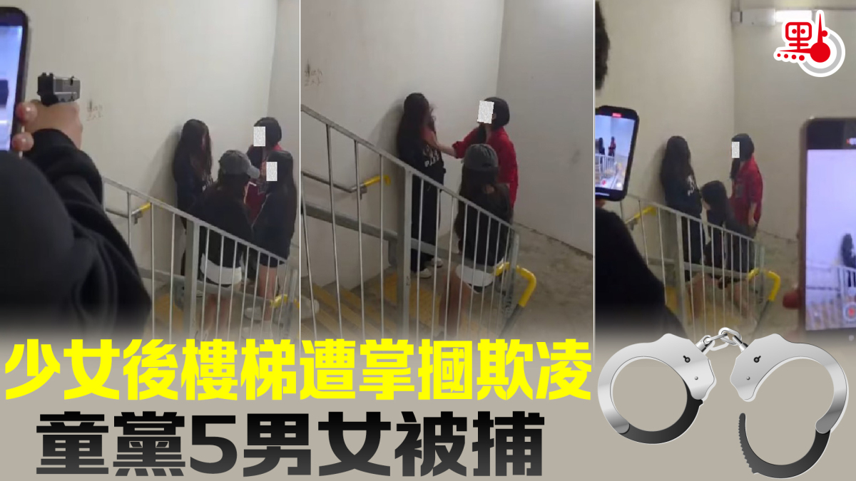 【點新聞報道】近日網上瘋傳一條童黨欺凌影片,涉及一名少女在粉嶺皇后山商場後樓梯遭年齡相若童黨包圍,用手機拍攝下施以掌摑、辱罵及氣槍指嚇欺凌過程。警方經調查後,迅速鎖定涉案童黨,昨日拘捕五人。