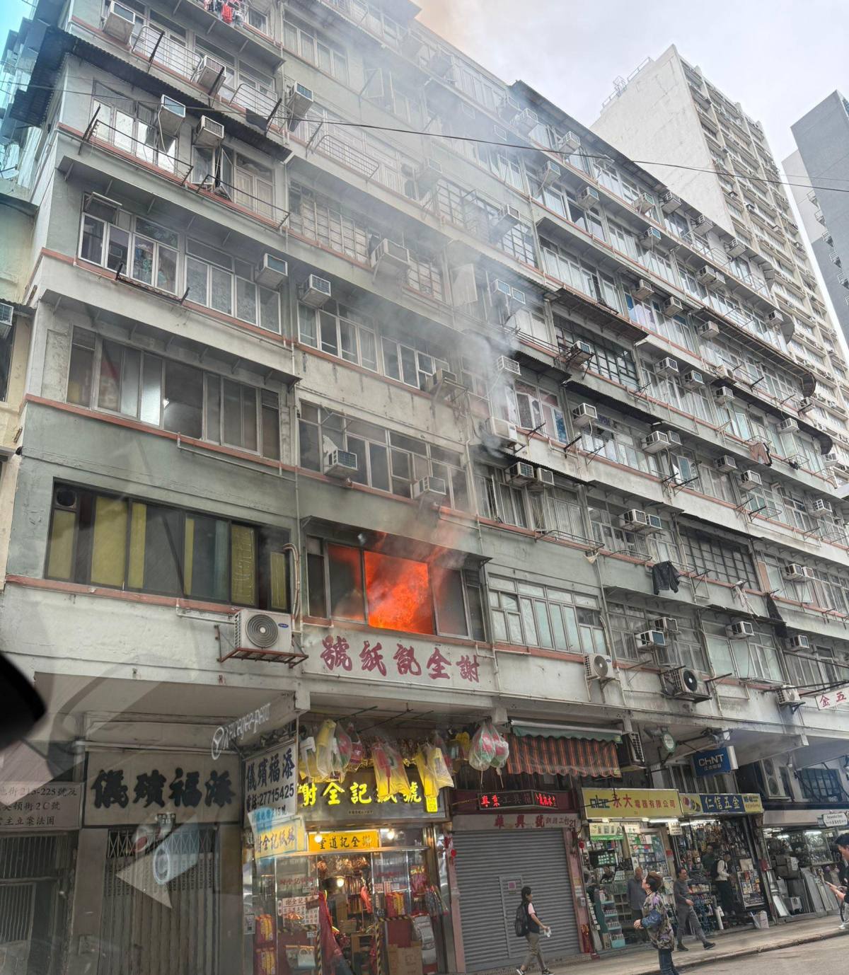 【點新聞報道】油麻地新填地街217號有唐樓低層起火,單位有火舌冒出,現場有大量濃煙,消防操作雲梯向起火單位射水撲救。