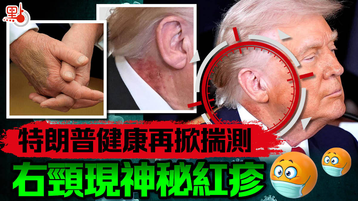 綜合外媒報道,特朗普周一在白宮出席向退役軍人頒發榮譽勳章的典禮上,被發現右頸出現疑似紅瘡或紅疹,從襯衫領口一直延伸到耳朵下方,並有結痂跡象。相關照片在社交網站X上瘋傳,有網民指:「特朗普脖子上有奇怪的痕跡。」也有人甚至稱看起來像「帶狀皰疹」。